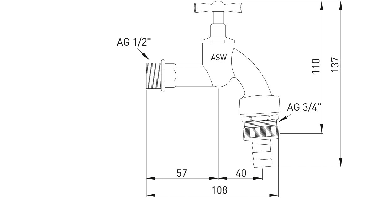 ASW Auslaufventil 1/2", Messing matt verchromt, Rohrbelüfter, Rückflussverhinderer, Schlauchverschraubung