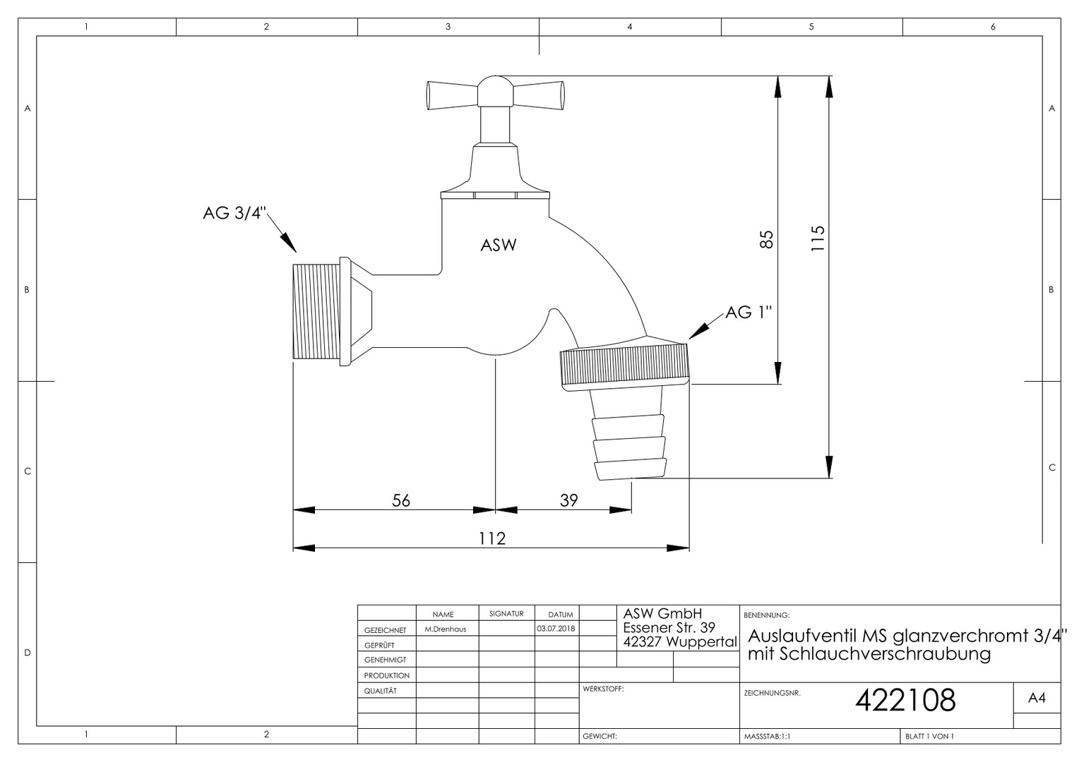 ASW Auslaufventil 3/4", Messing glanz verchromt, Schlauchverschraubung