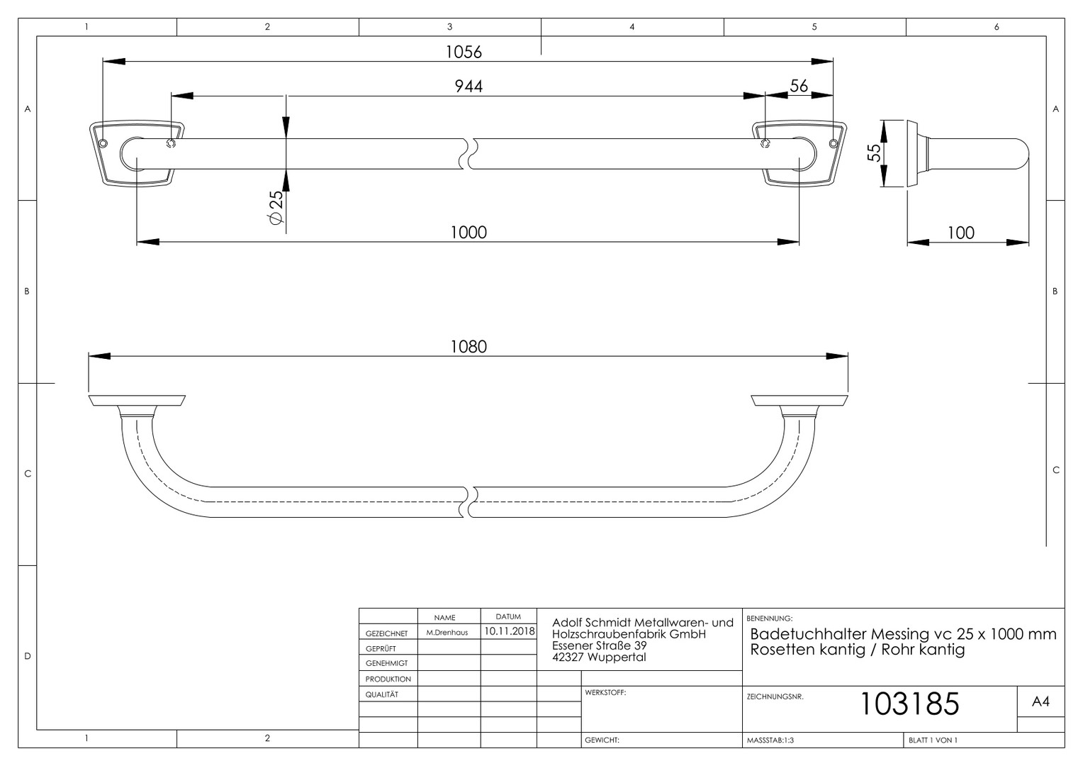 ASW Badetuchhalter Serie 1000 25 x 1000 mm, mit kantigem Mittelteil/Rosetten, Messing verchromt W381217