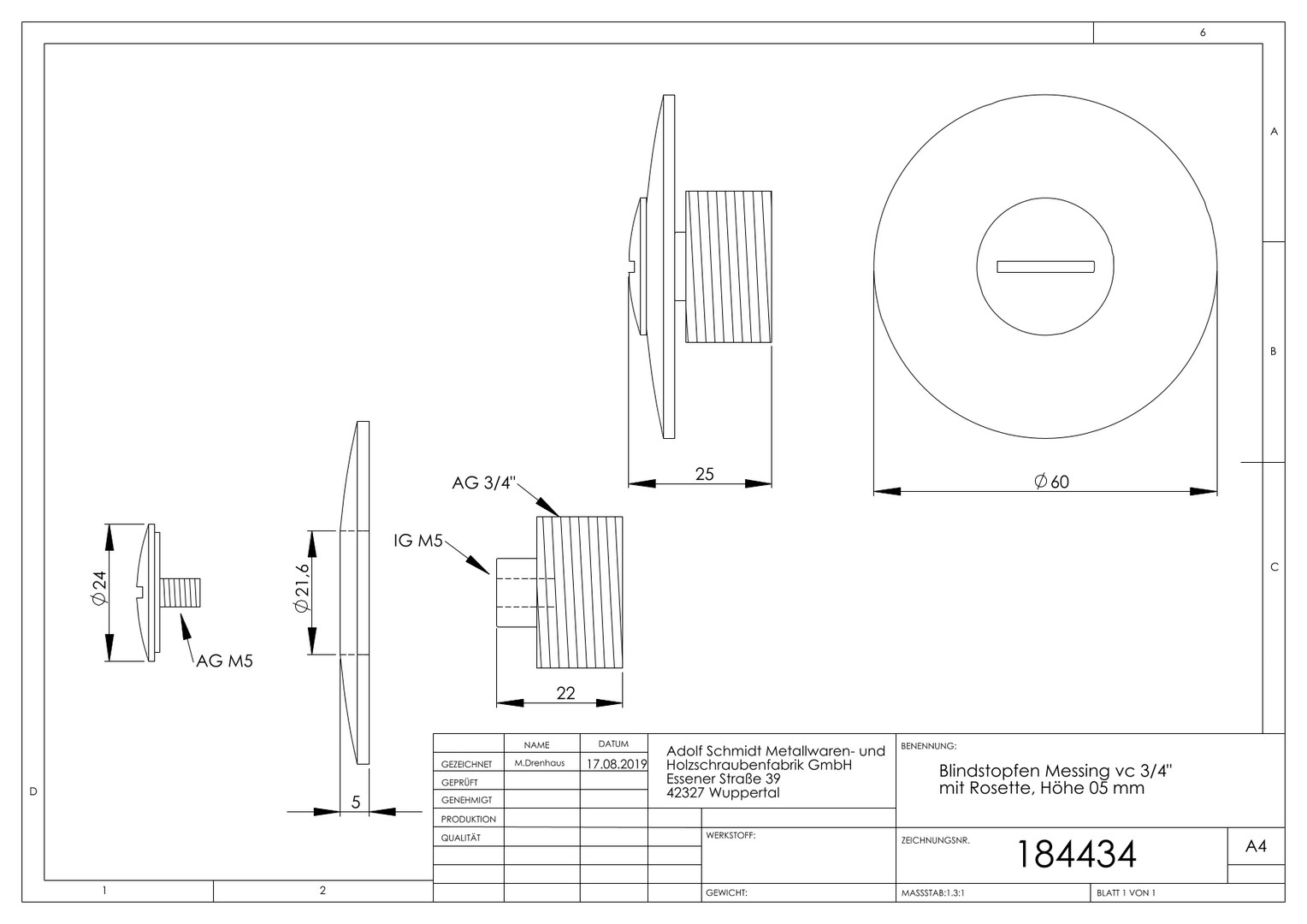 ASW Blindstopfen 3/4", Messing verchromt, komplett mit Rosette, Höhe 5mm W333436