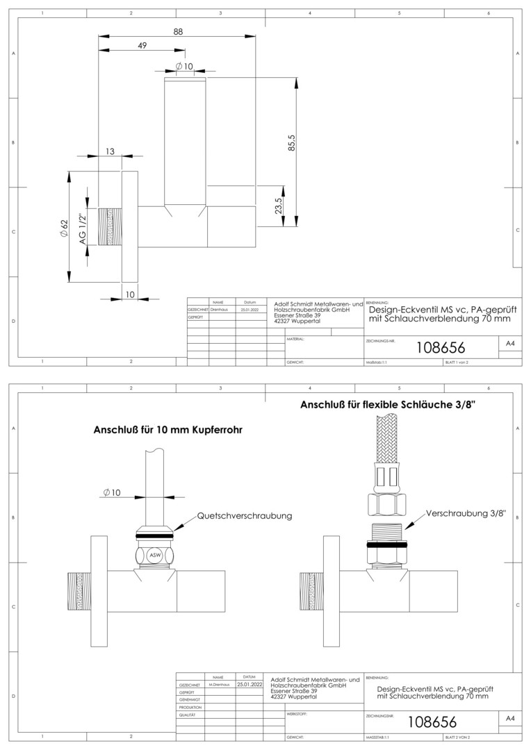 zur Montage mit Kupferrohr oder Flexschlauch, selbstdichtend, Quetschverschraubung mit MS-Schneidring und Armaturenanschlussschlauch 10 mm