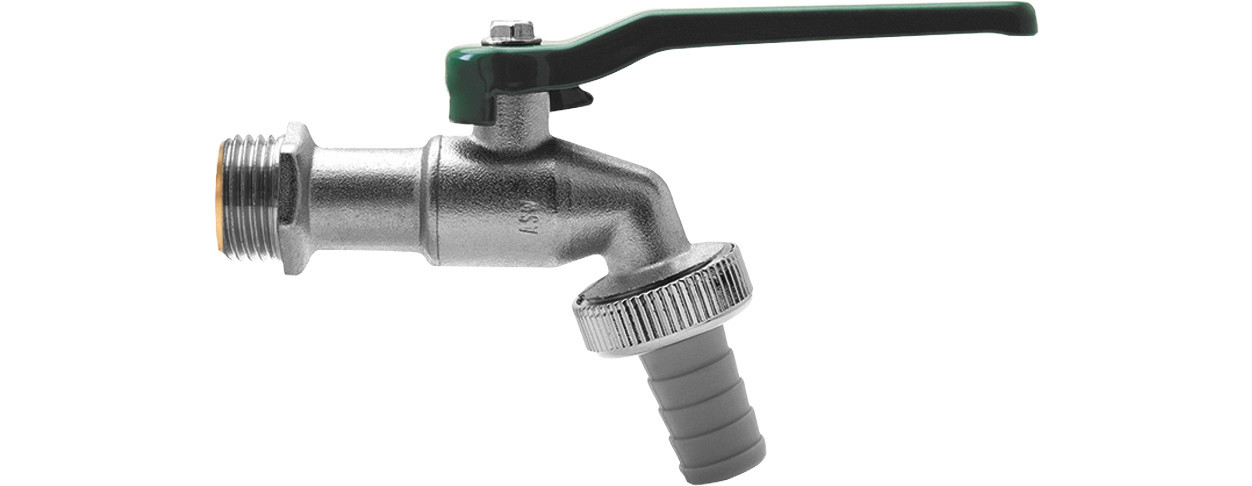 ASW Kugel-Auslaufventil 3/4", Griff grün, Messing CW617N matt verchromt, mit Schlauchverschraubung W797844