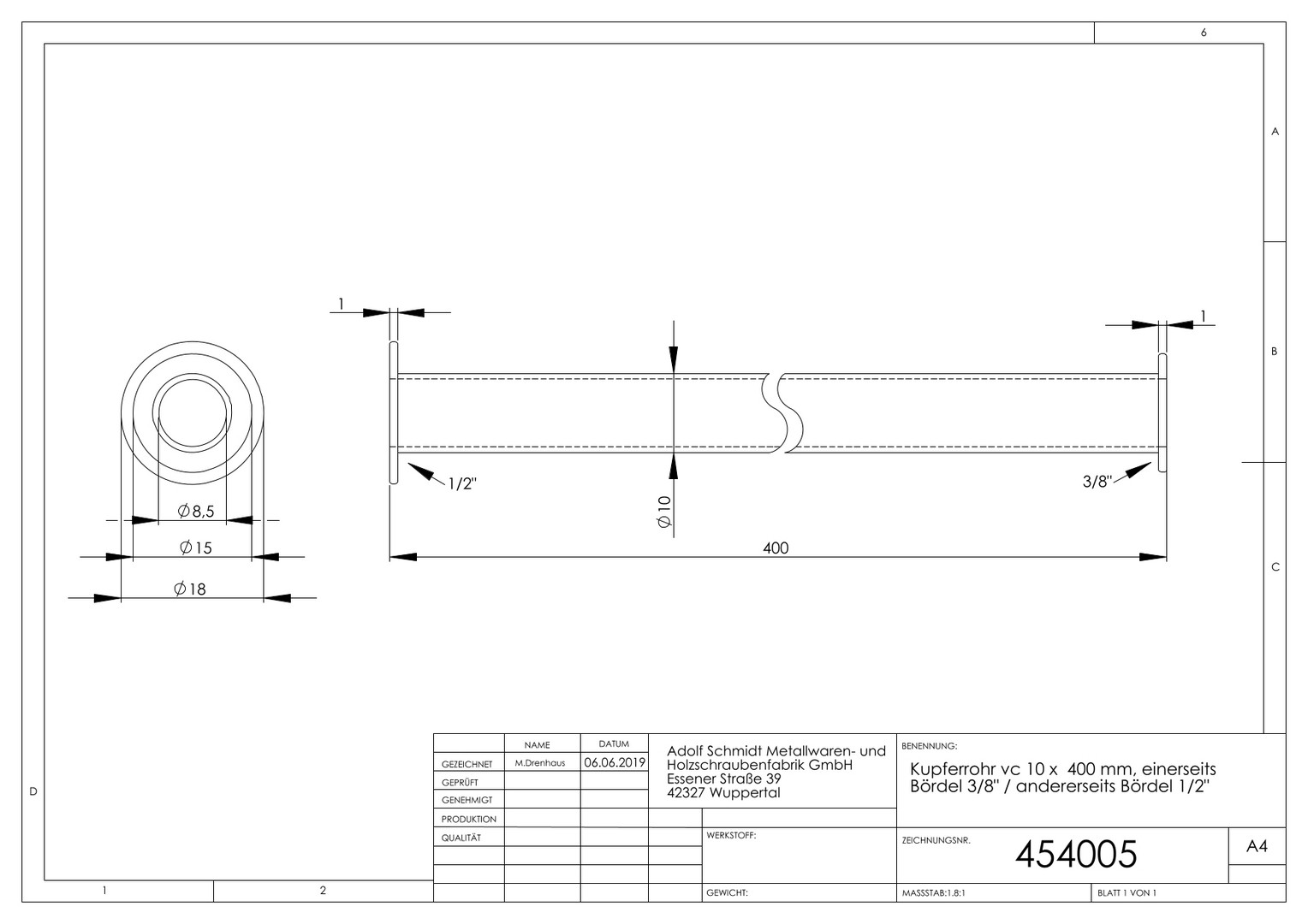 ASW Kupferrohr 10 x 400 mm, 3/8" Bördelx1/2" Bördel, verchromt