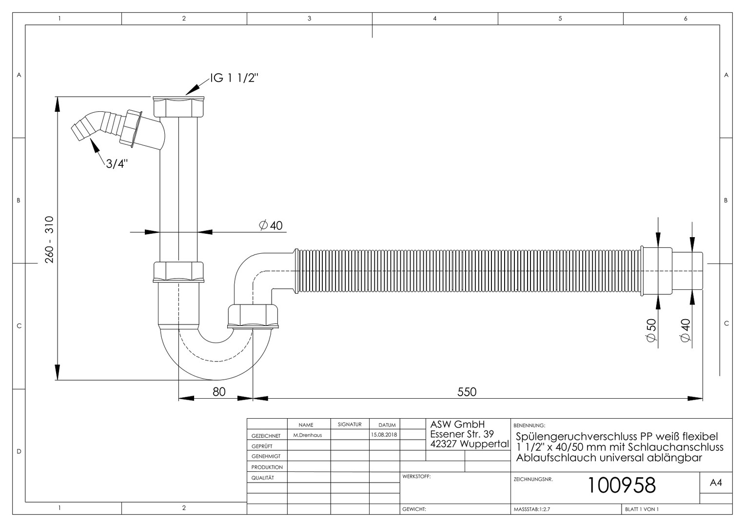 ASW Spülengeruchsverschluss 1 1/2" x 40/50 mm, universal ablängbar, PP weiß, Schlauchanschluss einfach W348528