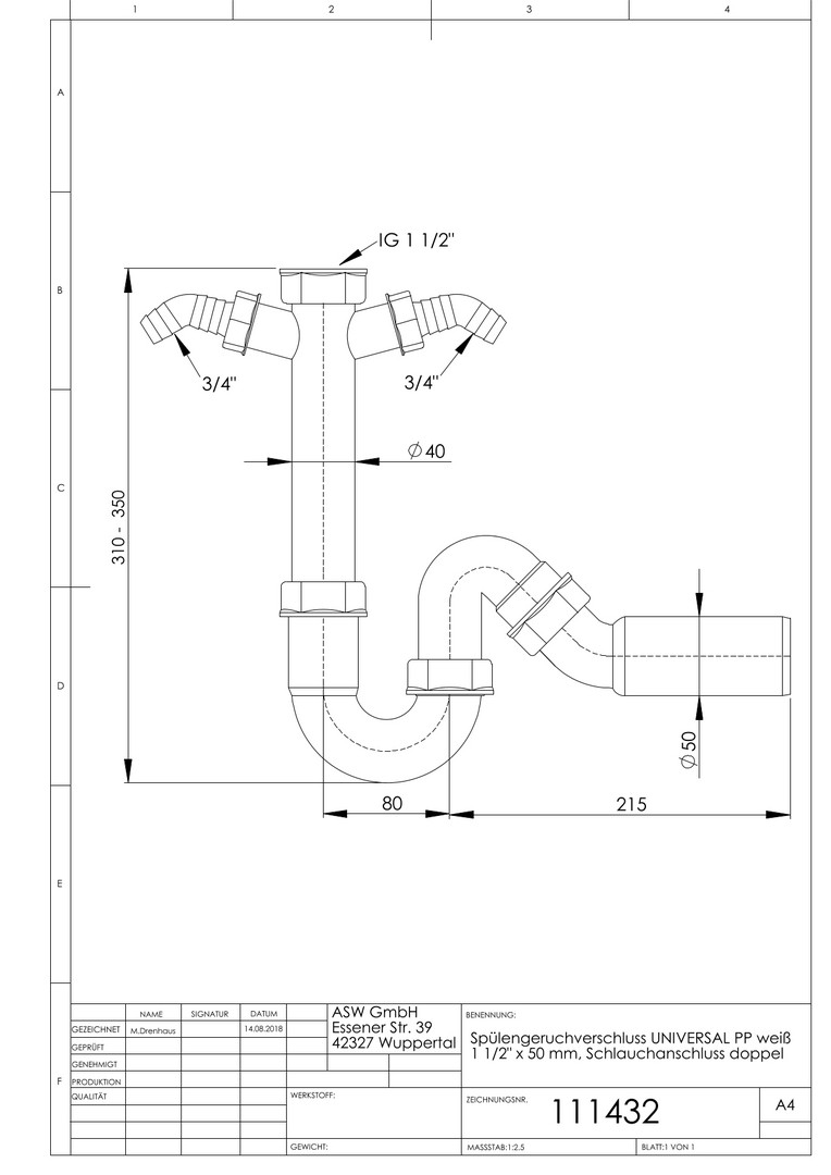 ASW Spülengeruchsverschluss 1 1/2" x 50 mm, universal, PP weiß, mit Schlauchanschluss doppelt W348645