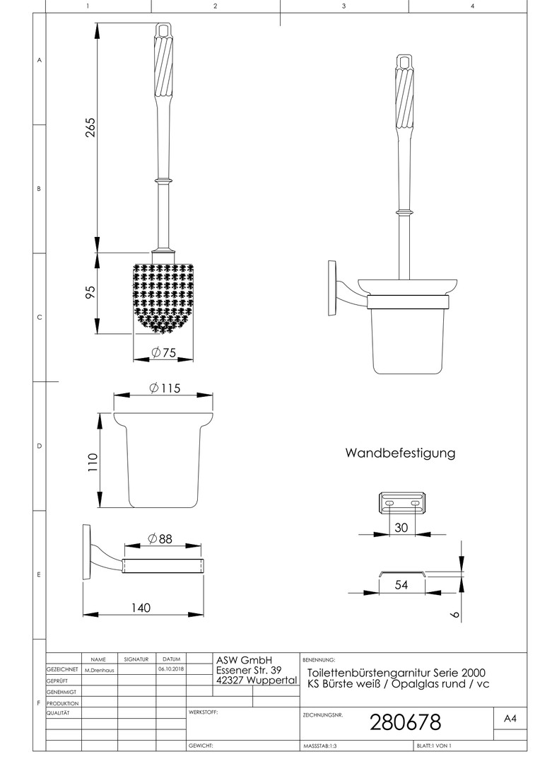 ASW Toilettenbürstengarnitur Serie 2000 Stiel KS vc/Bürste weiß, Metallguss verchromt, Opalglas rund W381178