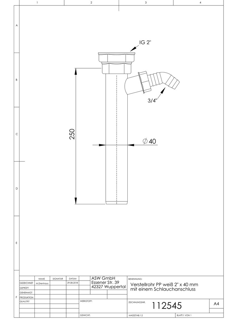 ASW Verstellrohr 2" x 40 x 250 mm, PP weiß, 1 Anschluss
