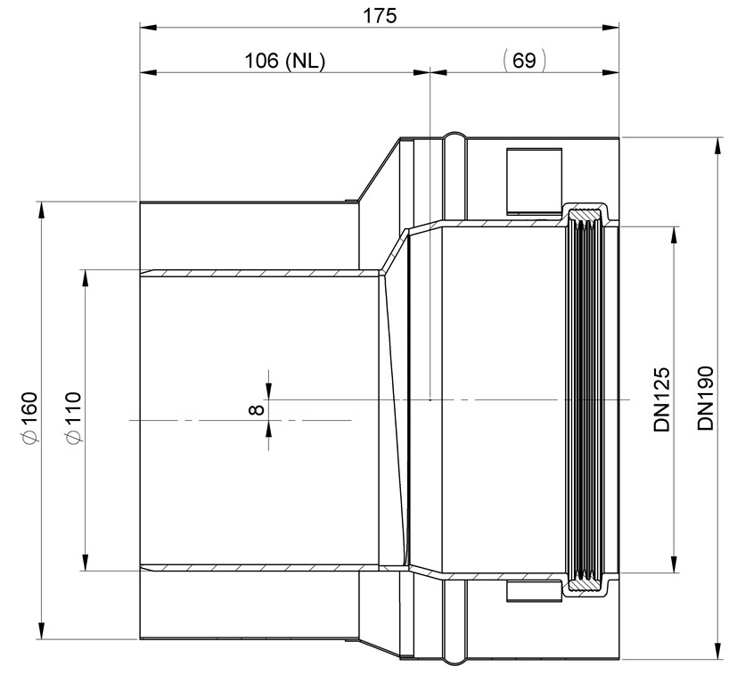 ATEC Erweiterung PolyClassic +Iron/White DN 125/190, D 110/160, exzentrisch, PP, Edelstahl blank W605161