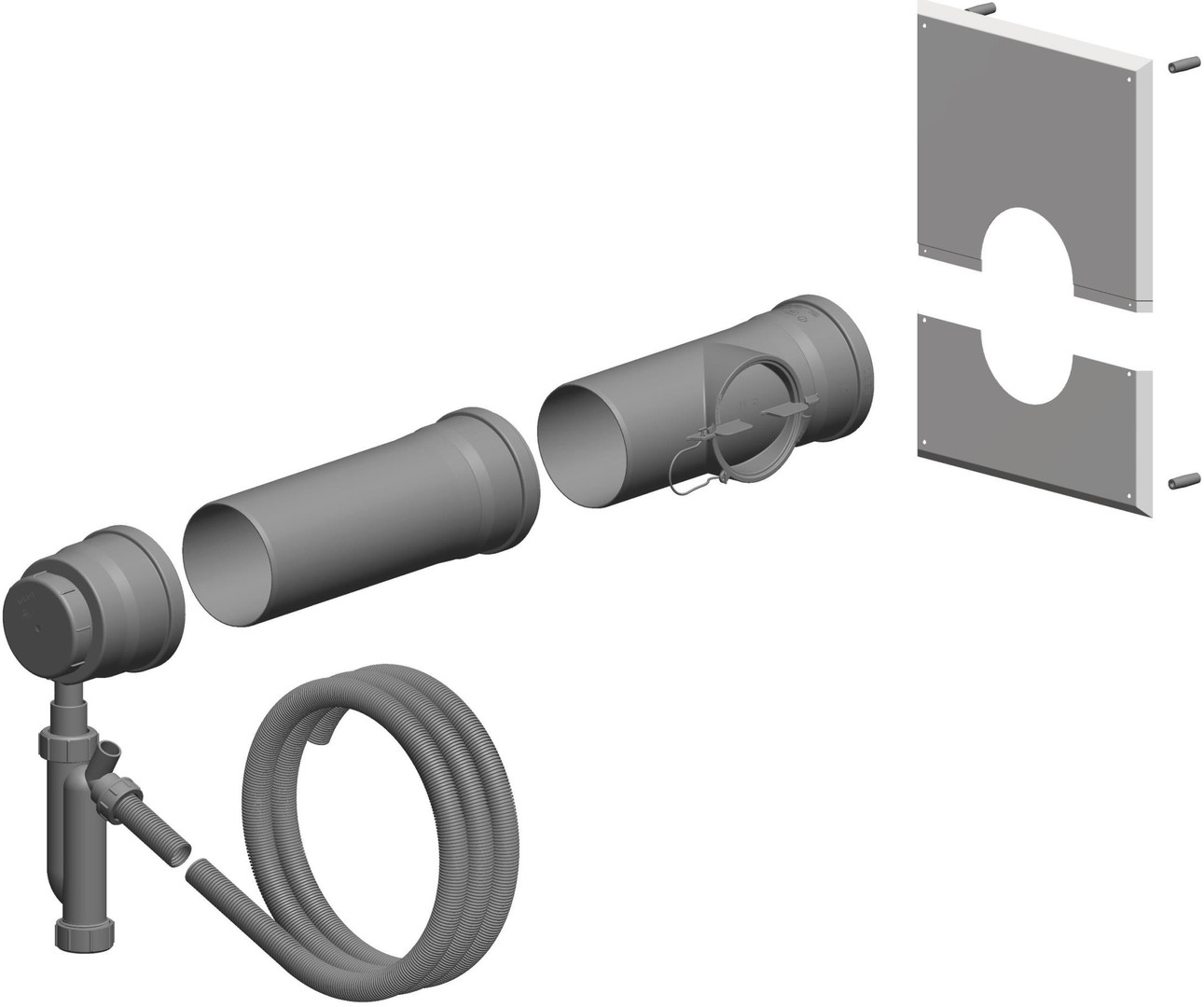 bestehend aus: Endstück mit Kondensatablauf, 2 m Kondensatschlauch, Siphon, Rohr 255 mm, Kontroll-Rohr, Wandblende mit Hinterlüftung