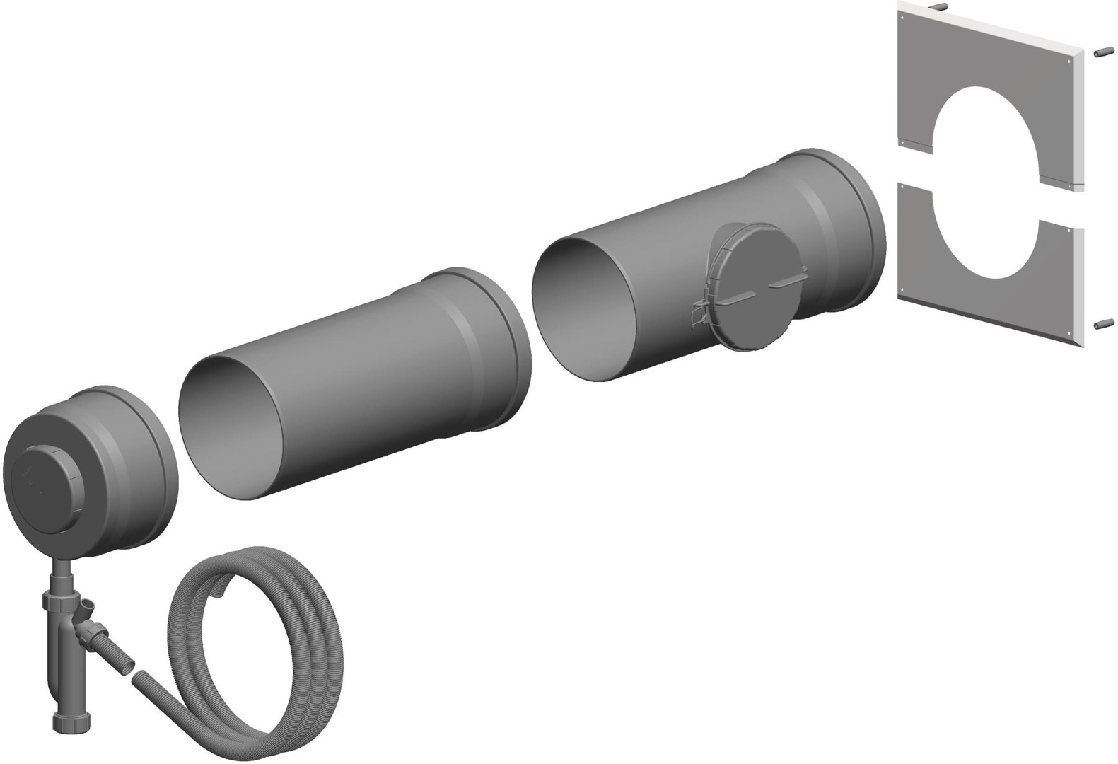 bestehend aus: Endstück mit Kondensatablauf, 2 m Kondensatschlauch, Siphon, Rohr 255 mm, Kontroll-Rohr, Wandblende mit Hinterlüftung
