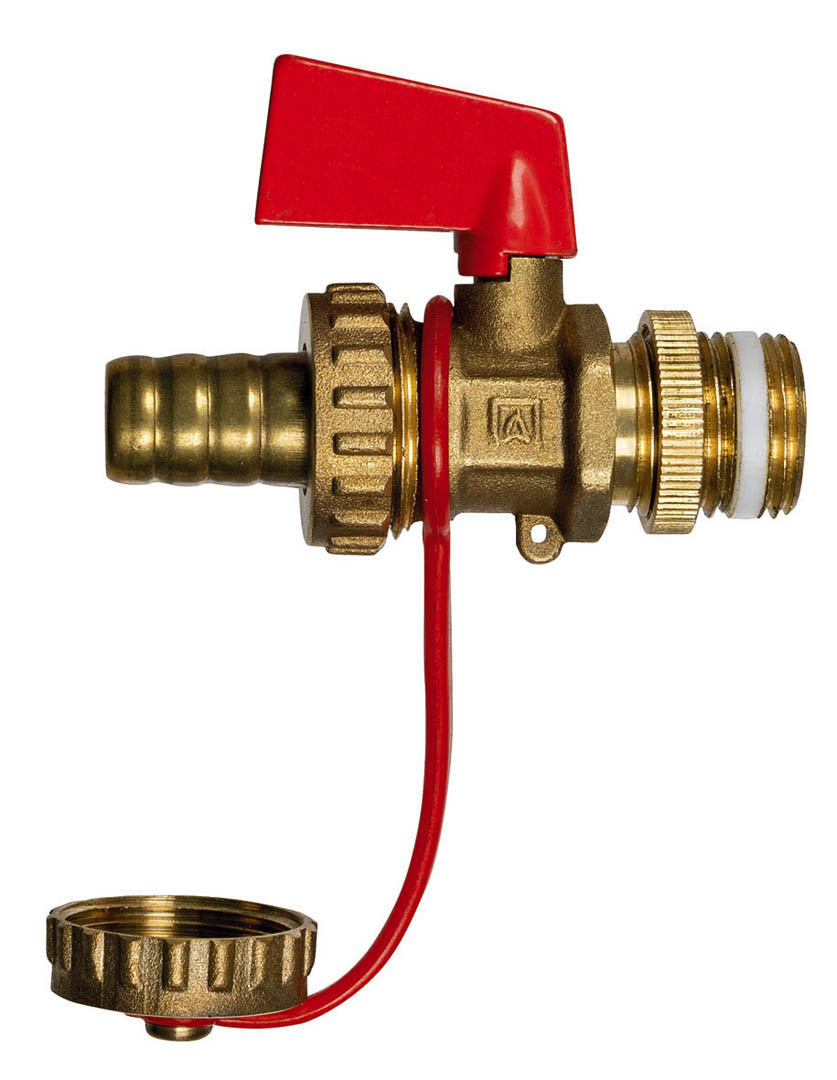 für geschlossene Heizungsanlagen nach EN 12828, Kesselfüll- und -entleerhahn, Kugelhahnausführung aus Messing, einerseits G 1/2-AG mit PTFE-Dichtring und Kontermutter, anderseits 1/2" Schlauchtülle mit G 3/4-Überwurfmutter und Blindkappe mit Kette oder Lasche