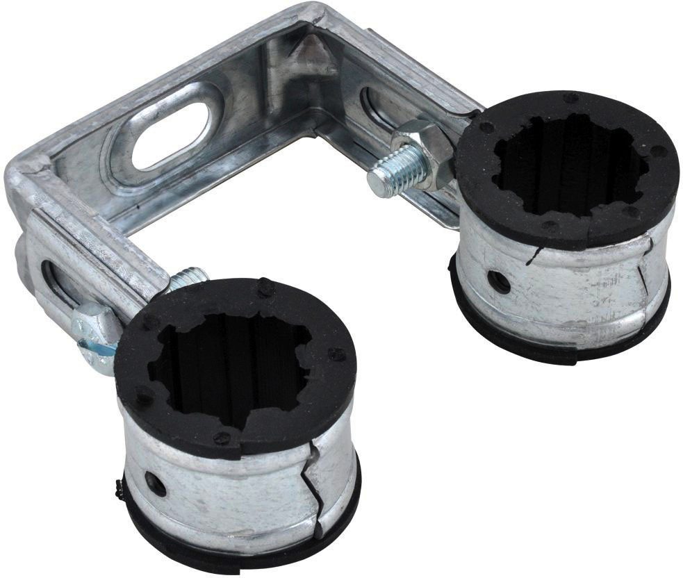 zwei profilierte Einschraubenschellen auf Doppelbügel, für Doppelbefestigung (2 Rohre), raumsparend, Schelle profiliert, durch Verzahnung verdrehsicher, Profilierung des Doppelbügels zur Verstärkung, Rohrisolierung nach Befestigung zu montieren, Abstand zwischen Rohr und Wand verstellbar, Einlage alterungsbeständige, Schallschutz für DIN 4109