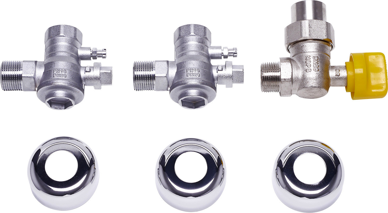 2x Wartungshähne R 3/4, Eckform mit Rosetten, 1x Gas-Eckhahn 3/4, Rosette 3/4, 25 mm, für Erd- und Flüssiggas
