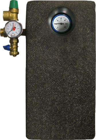 EPP-Gehäuse, zur Einbindung eines zweiten Kollektorfeldes oder eines zweiten Verbrauchers in den Solarkreis, hocheffiziente Solarkreispumpe bis 7 m Förderhöhe, Absperrhähne mit Thermometer und aufstellbaren Schwerkraftbremsen in Vor- und Rücklauf, Sicherheitsventil 6 bar mit Manometer und Abschluss für Ausdehnungsgefäß, Spül- und Befüllarmaturen, integrierter Luftabscheider, Volumenstromanzeige 1-12 l/min, Klemmringverschraubung für 15/22mm Rohr
