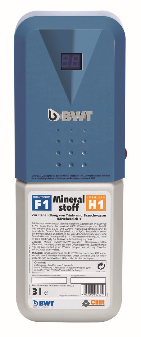 für AQA Perla und AQA Life S , Halterung zur Rohrleitungsmontage, Anschluss-Stück mit Impfstelle, Steuerelektronik in Modulbauweise mit integriertem Diagnosesystem, optische Betriebs-/Dosierfrequenzanzeige sowie optische und akustische Behälterwechsel-/Störanzeige, Sauglanze mit Niveauüberwachung (Trockenlaufschutz), Kindersicherung und Trafostecker, Netzanschluss 230/50-60 V/Hz
