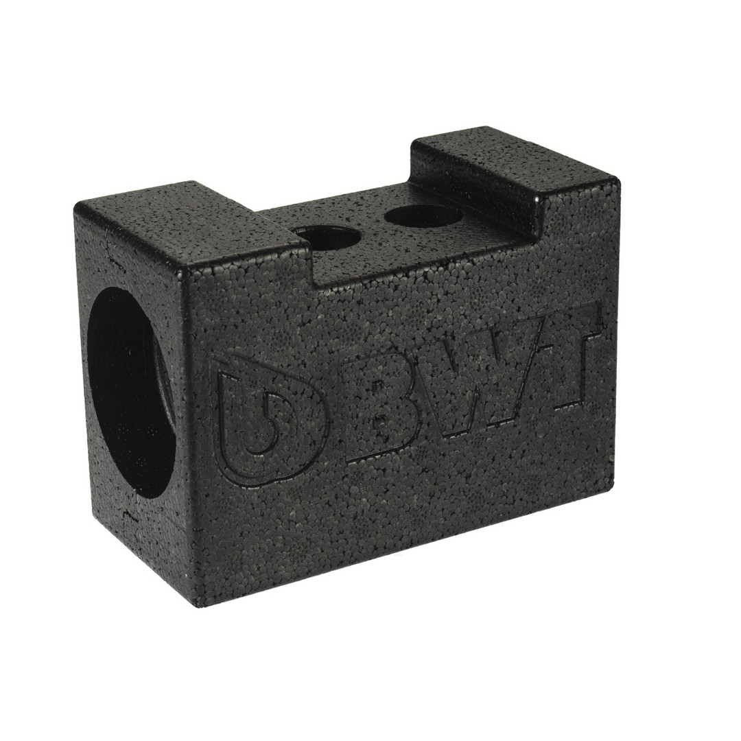 aus EPP für die schnelle und effiziente Isolierung, die Isolation besteht aus zwei Halbschalen und kann auch bei bereits montierten Multiblöcken nachträglich angebracht werden