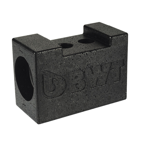 aus EPP für die schnelle und effiziente Isolierung, die Isolation besteht aus zwei Halbschalen und kann auch bei bereits montierten Multiblöcken nachträglich angebracht werden