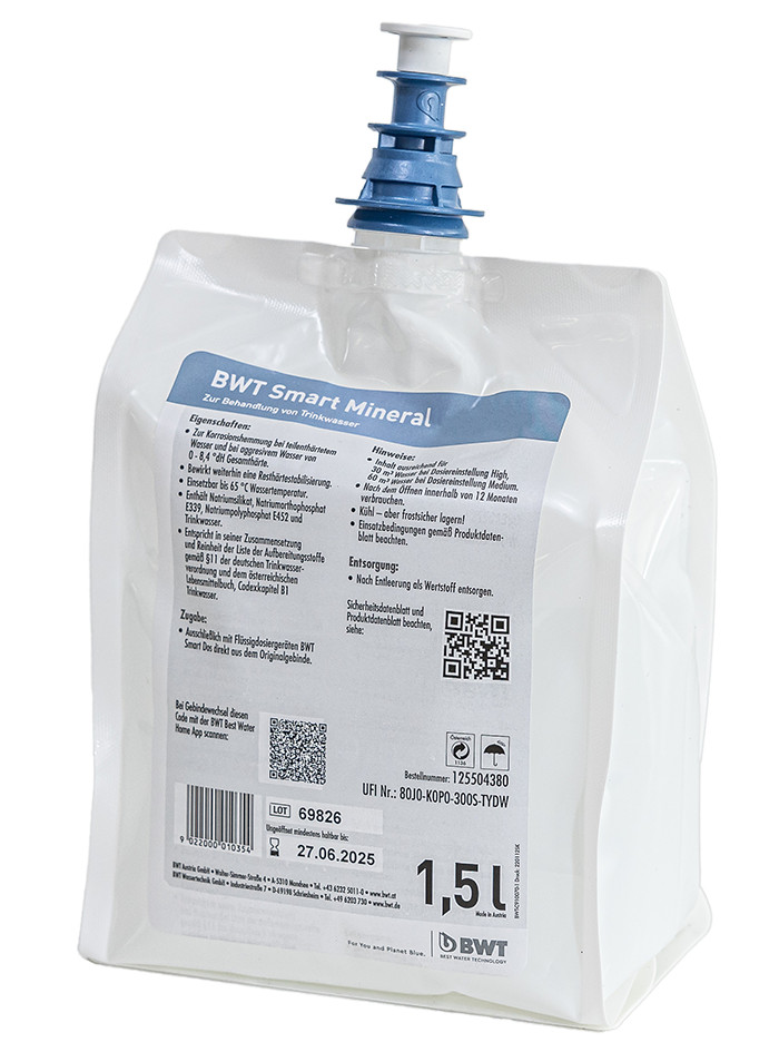 für BWT Smart Dos DT, zur DVGW-Prüfung angemeldet, Lieferung jeweils 2 x 1,5 l Beutel im Umkarton mit einer Reichweite von jeweils 30 m³ Wasser pro Beutel bei Sanierungsdosierung bzw. 60 m³ Wasser pro Beutel bei Erhaltungsdosierung