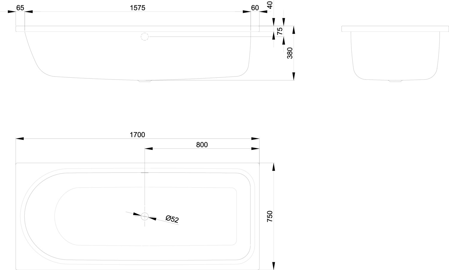 Badewanne BetteOcean Low-Line 8834 weiß, 170x75x38cm, Fußende rechts, Überlauf hinten W82305