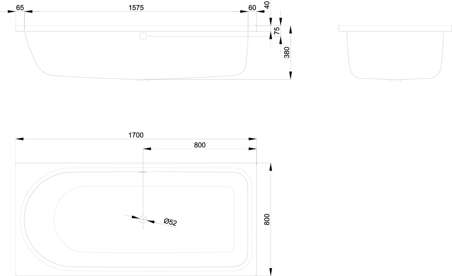 Badewanne BetteOcean Low-Line 8836 snow, 170x80x38cm, Fußende rechts, Überlauf hinten W82625