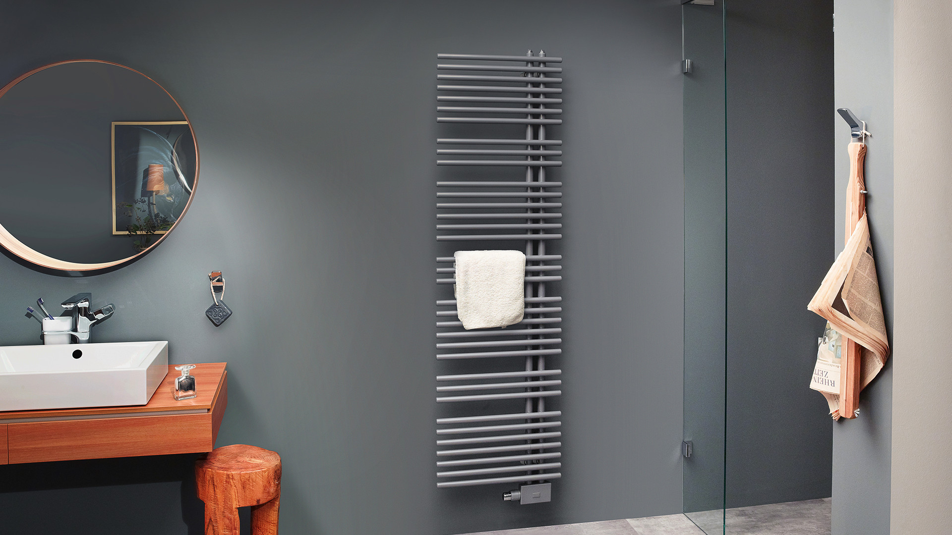 für Zentralheizung (zusätzliche Ausstattung mit Elektroheizstab) und für die Erwärmung von Handtüchern und Textilien, gerade Horizontal-Rundrohre 23 mm im Spezialschweißverfahren mit den vertikalen Rundrohren 30 mm wasserführend verbunden, symmetrische Anordnung der unterschiedlichen Rohrgruppen macht Asym über Kopf wendbar, wahlweise offene Seite rechts oder links), Vertikal-Rohre im Abstand von 50 mm für Vor- und Rücklauf positioniert, mit Anschlüssen DN 15 x 50 mm einseitig unten und oben, Oberfläche pulverbeschichtet DIN 55900 und bei ca. 180 °C eingebrannt, serienmäßiges Zubehör: 2 Entlüftungsstopfen DN 15 und 4 Befestigungen aus Stahl, mit Sechskant-Holzschrauben und Dübeln, Wärmeleistung nach DIN EN 442-2, Heizmedium Wasser: max. zul. Betriebstemperatur 100 °C, max. zul. Betriebsüberdruck 6 bar