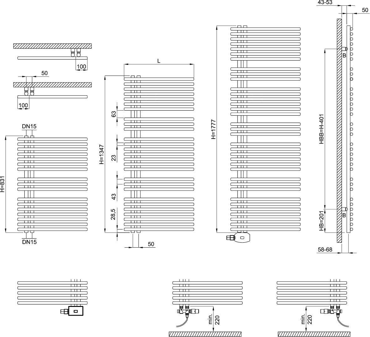 vorbereitet für reinen Elektrobetrieb bei Ausstattung mit einem der aufgeführten Elektroheizstäbe, für die Erwärmung von Handtüchern und Textilien und zur Raumerwärmung, gerade Horizontal-Rundrohre 23 mm im Spezialschweißverfahren mit den vertikalen Rundrohren 30 mm wasserführend verbunden, symmetrische Anordnung der unterschiedlichen Rohrgruppen macht Asymo über Kopf wendbar, wahlweise offene Seite rechts oder links), Vertikal-Rohre im Abstand von 50 mm positioniert, mit Wärmeträgerflüssigkeit vorgefüllt und wasserdicht verschlossen (Frostschutz bis -15 °C), Oberfläche pulverbeschichtet DIN 55900 und bei ca. 180 °C eingebrannt, serienmäßiges Zubehör: 4 Befestigungen aus Stahl, mit 3 Sechskant-Holzschrauben und Dübeln