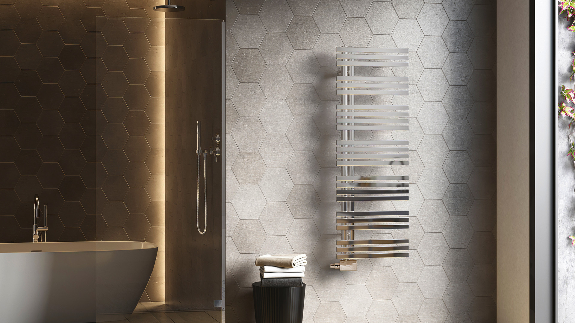 für den Zentralheizungsbetrieb (zusätzliche Ausstattung mit Elektroheizstab), gerade horizontale Rechteckrohre 30 x 15 mm, vertikale Quadratrohre 30 mm wasserführend verbunden, angeordnete Horizontalrohre mit Aufnahmeöffnungen für das seitliche Einhängen von Handtüchern und Textilien, Heizkörper ist über Kopf wendbar (wahlweise Anschlüsse links und langer Schenkel nach rechts oder Anschlüsse rechts und langer Schenkel nach links, Vertikalrohre im Abstand von 50 mm für Vor- und Rücklauf positioniert, mit Anschlüssen DN 15 (1/2") x 50 mm einseitig unten und oben, Oberflächen Edelstahl poliert oder satiniert, serienmäßiges Zubehör 2 Entlüftungsstopfen DN 15 (1/2") und 4 Befestigungen aus Stahl erfüllen AK3 nach VDI 6036, mit Sechskant-Holzschrauben und Dübel, Heizmedium Wasser, max. zul. Betriebstemperatur 95 °C, max. zul. Betriebsüberdruck 4 bar