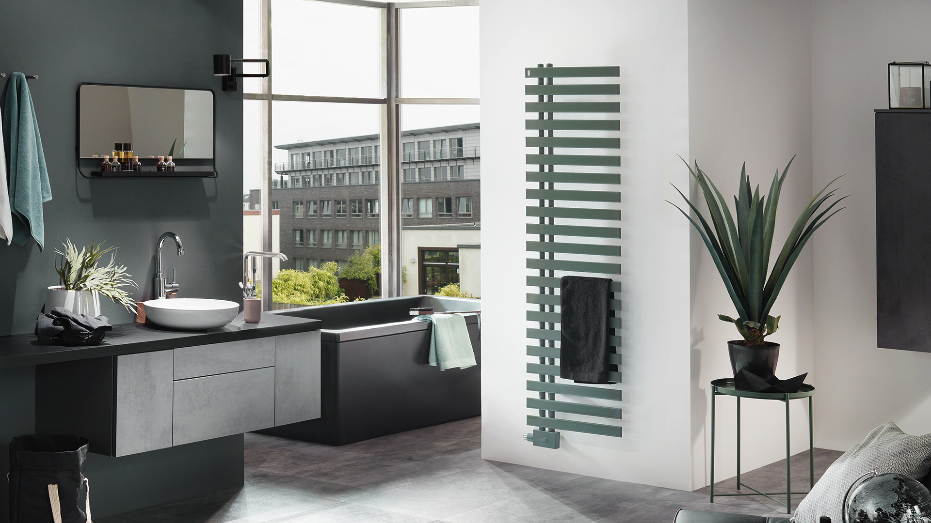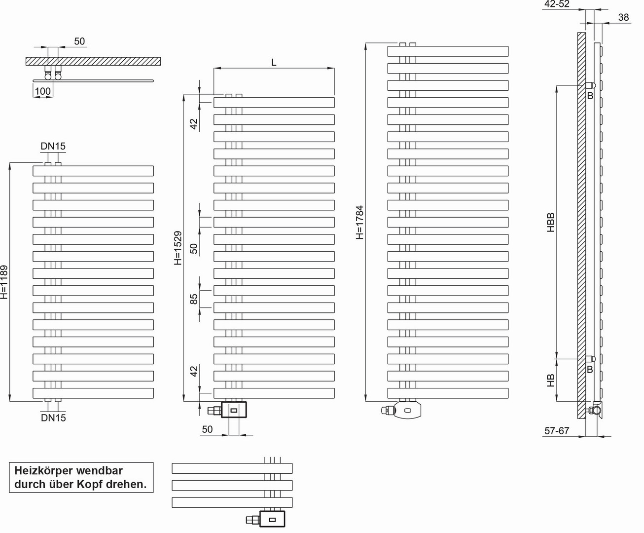 für Zentralheizung und für die Erwärmung von Handtüchern und Textilien, gerade, horizontale Paneelovalrohre 50 x 10 mm im Spezialschweißverfahren mit den vertikalen Rundrohren 30 mm wasserführend verbunden, durchgehend regelmäßig angeordnete Horizontalrohre mit vielen Lücken für das seitliche Einhängen von Handtüchern und Textilien, über Kopf wendbar, wahlweise offene Seite rechts oder links), Vertikal-Rohre im Abstand von 50 mm für Vor- und Rücklauf positioniert, mit Anschlüssen DN 15 x 50 mm einseitig unten und oben, Oberfläche pulverbeschichtet DIN 55900 und bei 180 °C eingebrannt, serienmäßiges Zubehör: 2 Entlüftungsstopfen DN 15 und 4 Befestigungen aus Stahl, mit Sechskant-Holzschrauben und Dübeln, Wärmeleistungen nach DIN EN 442-2, Heizmedium Wasser: max. zul. Betriebstemperatur 100 °C, max. zul. Betriebsüberdruck 4 bar, erhöhter Korrosionsschutz durch galvanische Verzinkung des Heizkörpers unter der Pulverbeschichtung