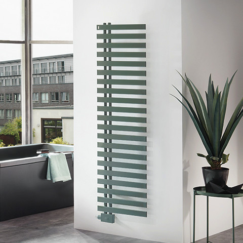 für Zentralheizung und für die Erwärmung von Handtüchern und Textilien, gerade, horizontale Paneelovalrohre 50 x 10 mm im Spezialschweißverfahren mit den vertikalen Rundrohren 30 mm wasserführend verbunden, durchgehend regelmäßig angeordnete Horizontalrohre mit vielen Lücken für das seitliche Einhängen von Handtüchern und Textilien, über Kopf wendbar, wahlweise offene Seite rechts oder links), Vertikal-Rohre im Abstand von 50 mm für Vor- und Rücklauf positioniert, mit Anschlüssen DN 15 x 50 mm einseitig unten und oben, Oberfläche pulverbeschichtet DIN 55900 und bei 180 °C eingebrannt, serienmäßiges Zubehör: 2 Entlüftungsstopfen DN 15 und 4 Befestigungen aus Stahl, mit Sechskant-Holzschrauben und Dübeln, Wärmeleistungen nach DIN EN 442-2, Heizmedium Wasser: max. zul. Betriebstemperatur 100 °C, max. zul. Betriebsüberdruck 4 bar, erhöhter Korrosionsschutz durch galvanische Verzinkung des Heizkörpers unter der Pulverbeschichtung