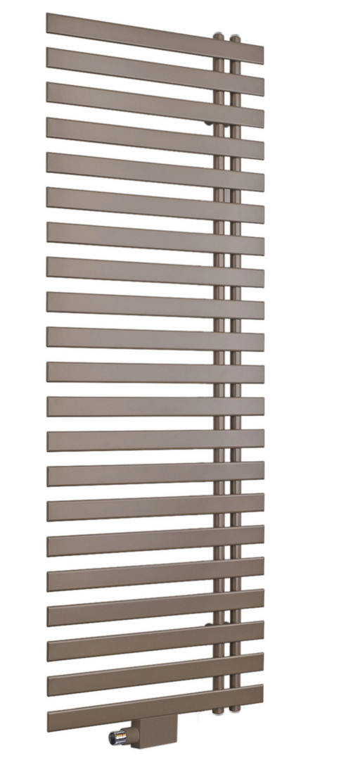 für Zentralheizung (zusätzliche4 Ausstattung mit Elektroheizstab), gerade, horizontale Paneelovalrohre 50 x 10 mm im Spezialschweißverfahren mit den vertikalen Rundrohren 30 mm wasserführend verbunden, durchgehend regelmäßig angeordnete Horizontalrohre mit vielen Lücken für das seitliche Einhängen von Handtüchern und Textilien, vertikale Sammelrohre im Abstand von 50 mm rechts außen, Horizontalrohre nach links offen, Anschlüsse DN 15 (1/2") x 50 mm mittig unten sowie einseitig rechts oder links unten und oben in den vertikalen Sammelrohren, Oberfläche pulverbeschichtet DIN 55900 und bei 180 °C eingebrannt, Serienmäßiges Zubehör: 2 Blind- und Entlüftungsstopfen DN 15 (1/2") und 4 Befestigungen aus Stahl erfüllen AK3 nach VDI 6036, mit Sechskant-Holzschrauben und Dübeln, Wärmeleistungen nach DIN EN 442-2, Heizmedium Wasser: max. zul. Betriebstemperatur 100 °C, max. zul. Betriebsüberdruck 4 bar