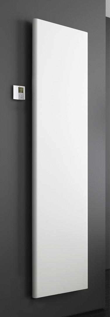 für rein elektrischen Betrieb, mit planer Front, halbrunden Seitenlinien und seitlichen Schatten Lichtfugen, die innen enden und so eine Fuge zur Wand für Schatten oder Licht frei lassen, die Seiten haben einen verdeckten Falz zur Aufnahme der optional lieferbaren LED-Hinterleuchtung, elektrischer Anschluss 230 V/50 Hz, Klasse I, IP21, über ca. 1 m Anschlusskabel (Kabelenden abisoliert, Ausgang unten links), Oberfläche pulverbeschichtet DIN 55900 und bei ca. 180 °C eingebrannt, nicht mit Wärmeträgerflüssigkeit gefüllt, die Erwärmung erfolgt schnell und durch eine elektrisch doppelt isolierte Heizmatte, rückseitig verteilt über die Frontflächen, Serienmäßig mit integriertem Heizstab mit elektronischer Regelung mit Uhrenraumthermstat, Zubehör: 1 Wandträger erfüllt AK 3 nach VDI 6036, mit Schrauben und Dübeln sowie Aushebesicherung unten