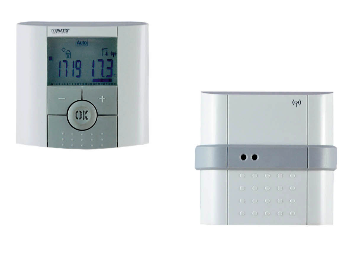 bestehend aus Funk-Uhrenraumthermostat digital, mit Wochenprogramm mit 9 voreingestellten Programmen, individuell programmierbar, Ferien- und Party-Funktion, Frostschutzfunktion, Tastensperre, Funktion geöffnetes Fenster, Einstellbereich 5-35 °C, IP30, mit 2 Batterien Typ AAA LR03 1,5 V, Gehäuse weiß, Maße 83 x 80 x 27 mm (BxHxT), Funk-Empfänger, zur Montage und Anschluss auf UP-Dose, Klasse 2, 230 VAC, max. Schaltleistung 16 A, IP20, Gehäuse weiss, Maße 87 x 87 x 20 mm (BxHxT), passend zu Funk-Raumthermostat und Funk-Uhrenraumthermostat