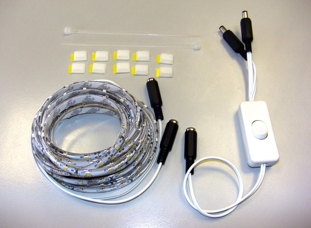 bestehend aus 2 LED-Streifen Warmweiß, 12 VDC, 4,8 W/m, IP55, mit Anschlusskabel (250- 300 mm Länge) mit Buchse D 5,5/d 2,1, selbstklebend zur Montage rückseitig links und rechts in den hinteren vertikalen Falzen der Heizkörperfront, Schnur-Zwischenschalter mit Kabelenden/Y-Kabel und Gerätestecker bzw. Buchse D 5,5/d 2,1, mit 10 selbstklebenden Kabelhaltern zur Fixierung der Anschlusskabel unten rückseitig an Heizkörperfront, Niederspannung