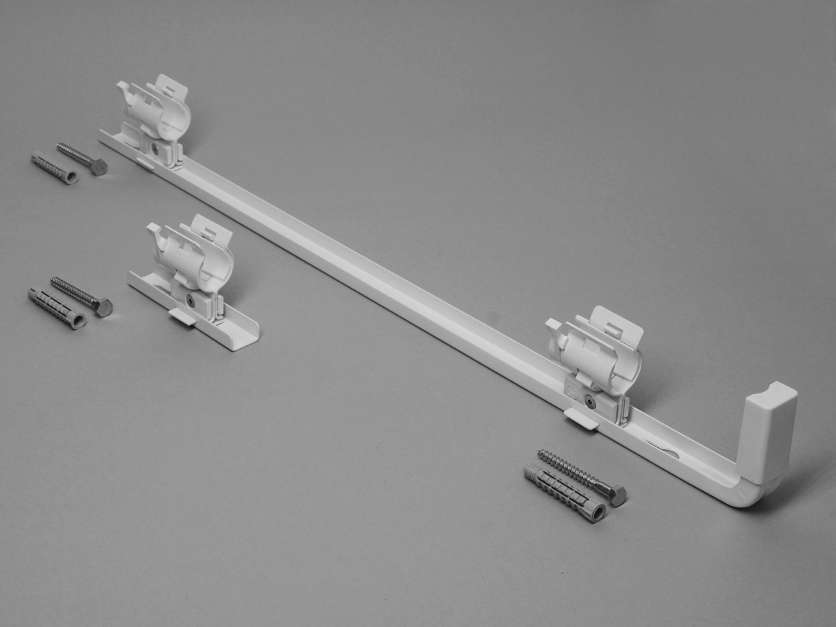 für alle Mehrsäuler-Röhrenradiatoren (2- 6-Säuler) ab Bauhöhe 300 mm, Stahlschiene mit unterem Auflager mit Schallschutz und 2 Klemmhaltern, für Rundrohr 25 mm mit Verriegelung und gleichzeitiger Aushebesicherung, aus transparentem Kunststoff, zur Befestigung am hinteren Rundrohr des Heizkörpers, alle Metallteile weiß pulverbeschichtet, Schalldämmteile aus transparentem Kunststoff, mit erforderlicher Anzahl Schrauben und Dübel (für festes Mauerwerk), umschließende Verriegelung des Rohres (kein Herausrutschen nach vorne möglich), Sicherungsriegel gegen unbeabsichtigtes Öffnen der Halter, kein Spezialwerkzeug zum bedienen der Verriegelungen erforderlich, gleichzeitig gegen Ausheben gesichert, horizontaler Toleranzausgleich durch gleitend gelagerte Halter (+/-5 mm), Unauffällig da hinter einem vertikalen Rundrohr, mit erforderlicher Anzahl Schrauben und Dübel, für die gängigsten Heizkörpergrößen müssen in der Regel nur noch 2 Befestigungselemente statt 4 Einzelkonsolen angezeichnet, gebohrt, montiert und ausgerichtet werden, keine Ausrichtung zwischen oberen und unteren Befestigungen notwendig