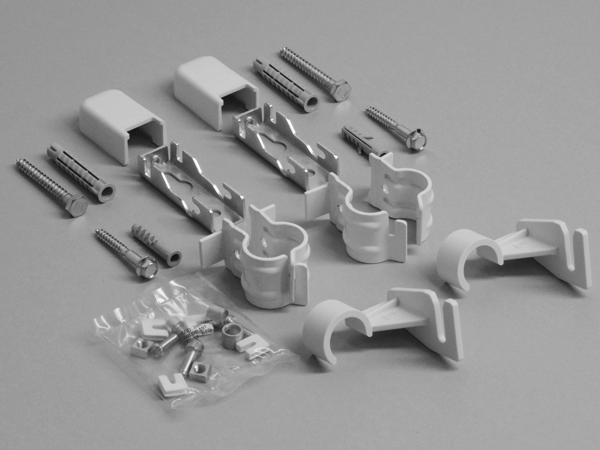 bestehend aus Wandkonsole und Abstandhalter aus Kunststoff, Halbschalen weiß pulverbeschichtet, verzinkter Wandträger mit Schalldämmeinlage und Stellschraube zur Feinausrichtung der Höhe, Abdeckung aus weißem Kundstoff sowie Abstandhalter zum Verschrauben mit der Wand gegen Abheben, mit Schrauben und Dübel, die Konsole (Klemmteile) muss direkt unter dem Kopfstück des Radiators montiert werden