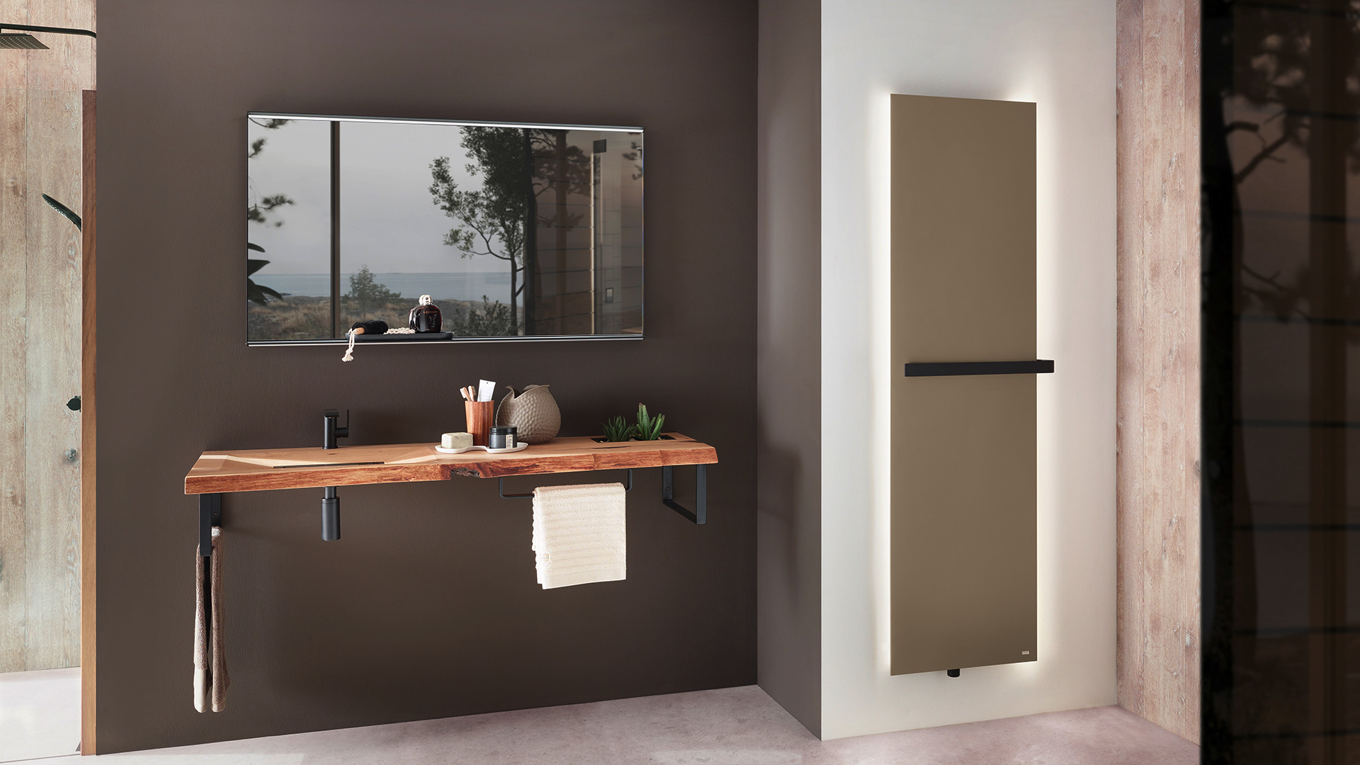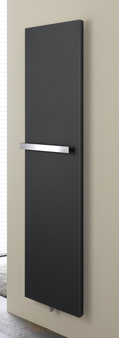 für den Zentralheizungsbetrieb (zusätzliche Ausstattung mit Eletroheizstab), mit planer Front, feinen Seitenlinien und seitlichen Schatten Lichtfugen, Grundkörper ohne Konvektionslamellen in geschweißter Ausführung aus horizontalen Rundrohren 35 mm und 2-reihig vertikal angeordneten Flachprofilrohren 50 x 10 mm, pulverbeschichtet, die Seiten der Front sind im 60° Winkel nach innen gestellt und lassen eine Fuge zur Wand für Schatten oder Licht frei, die Seiten haben einen verdeckten Falz zur Aufnahme der optional lieferbaren LED-Hinterleuchtung, Plane Front verblendet die komplette Ventilgarnitur mit Mittenanschluss DN 15 (1/2") x 50 mm für Vorlauf links oder rechts und Eck-Anschluss mit Eurokonus für Klemmringverschraubung, lediglich der Bedienknauf des optionalen Thermostats ist sichtbar, zusätzlicher Anschluss für Elektroheizstab DN 15 (1/2") von unten links, Oberfläche pulverbeschichtet DIN 55900 und bei ca. 180 °C eingebrannt, Serienmäßiges Zubehör: Ventilgarnitur bestehend aus Thermostatventil voreinstellbar, Rücklaufverschraubung und Anschlussteilen, Entlüftungsstopfen DN 8 (1/4") und 1 Wandträger mit Schrauben und Dübel, Wärmeleistung nach NIN EN 442-2, Heizmedium Wasser, max. zul. Betriebstemperatur 100 °C, max. zul. Betriebsüberdruck 6 bar