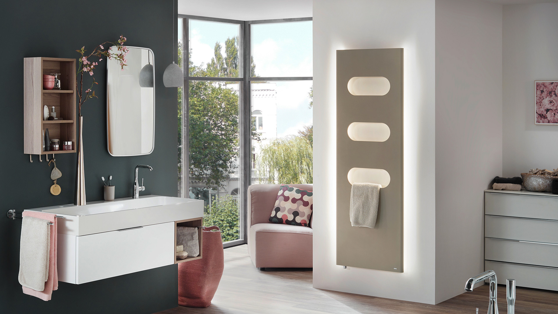 für den Zentralheizungsbetrieb (zusätzliche Ausstattung mit Elektroheizstab) mit planer Front, 3 Öffnungen im Einklang mit den halbrunden Seitenlinien zur Handtuchablage und seitlichen Schatten Lichtfugen, Grundkörper ohne Konvektionslamellen in geschweißter Ausführung aus vertikalen Rundrohren 35 mm und horizontal angeordneten Flachprofilrohren 50 x 10 mm, pulverbeschichtet, die halbrunden, softigen Seiten enden im 60° Winkel nach innen und lassen eine Fuge zur Wand für Schatten oder Licht frei, die Seiten haben einen verdeckten Falz zur Aufnahme der optional lieferbaren LED-Hinterleuchtung, plane Front verblendet die komplette Ventilgarnitur für Mittenanschluss DN 15 (1/2“) x 50 mm, der Bedienknauf des optionalen Thermostaten ist sichtbar, Oberfläche pulverbeschichtet DIN 559000 und bei ca. 180 °C eingebrannt, serienmäßiges Zubehör Anschlussgarnitur bestehend aus Ventil mit Verschraubung DN 15 (1/2") und absperrbaren Eckverschraubungen DN 15 (1/2") mit AG DN 20 (3/4") Eurokonus für Rohranschluss mittels Klemmringverschraubung, flexiblen Anschlussleitungen, 1 Doppelnippel DN 15 (1/2"), 1 Entlüftungsventil DN 15 (1/2"),1 Wandträger oben und 1 Abhebesicherung unten, mit Schrauben und Dübeln, Wärmeleistungen nach DIN EN 442-2, Heizmedium Wasser, max. zul. Betriebstemperatur 100 °C, max. zul. Betriebsüberdruck 6 bar
