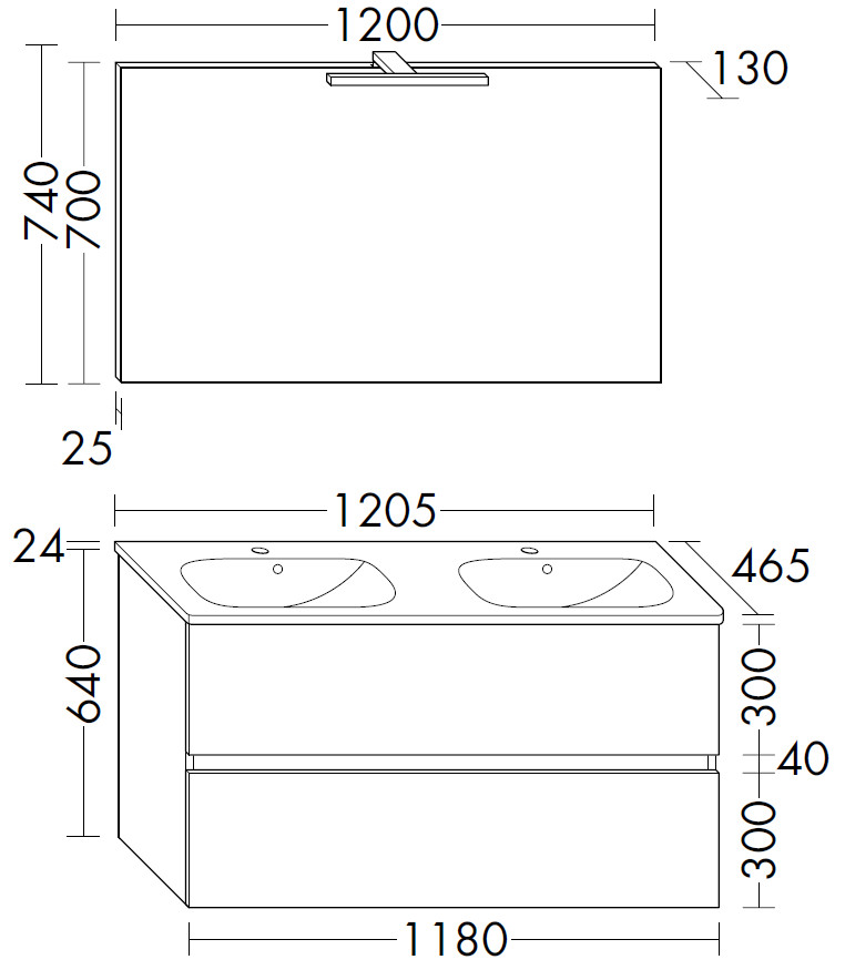 bestehend aus: Spiegel mit LED-Aufsatzleuchte, 5 W, 4000 K, Energieeffizienzklasse G, chrom, für Raumschaltung, Korpus Alu-Optik, IP44, Keramik-Waschtisch, Muldentiefe 120 mm, Waschtischunterschrank, 2 Auszüge, 300 mm tief, mit Raumsparsiphon