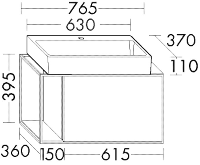 Waschtisch: Muldentiefe: 100 mm, Unterschrank: Konsolenplatte weiß, 1 Auszug, 1 Ablageplatte unten, weiß, 1 Handtuchhalter, Alurahmen schwarz eloxiert, mit Raumsparsiphon
