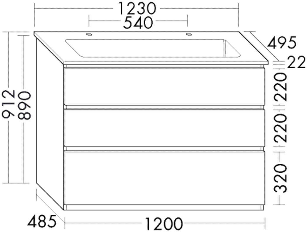 mit 2 Armaturbohrungen, Waschtisch: Muldentiefe 120 mm, mit Sicherheitsablaufventil, nicht absperrbar, Unterschrank: 1 Schublade oben, 350 mm tief, mit Siphonausschnitt und Inneneinteilung, 1 Schublade mittig, 350 mm tief, 1 Auszug unten, 350 mm tief, mit Raumsparsiphon, Sockelleiste