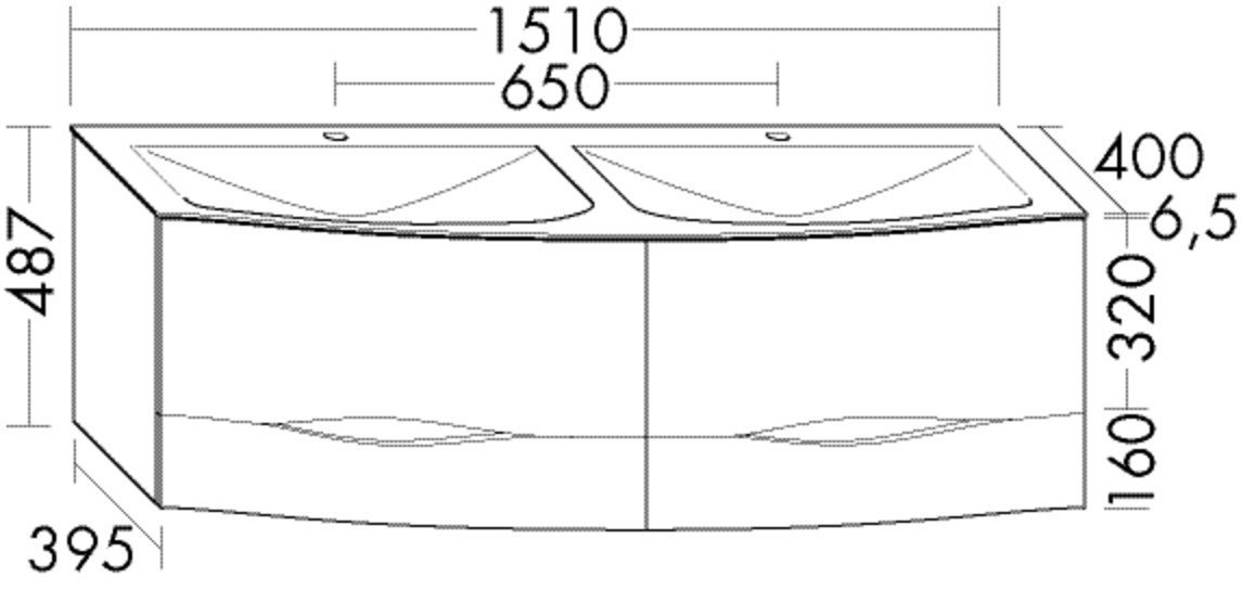 Waschtisch: Muldentiefe 130 mm, Unterschrank: 2 Auszüge oben mit Siphonausschnitt und Griffmulde, 2 Schubladen unten mit Griffmulde, 1 Inneneinteilung, mit cleanFlow
