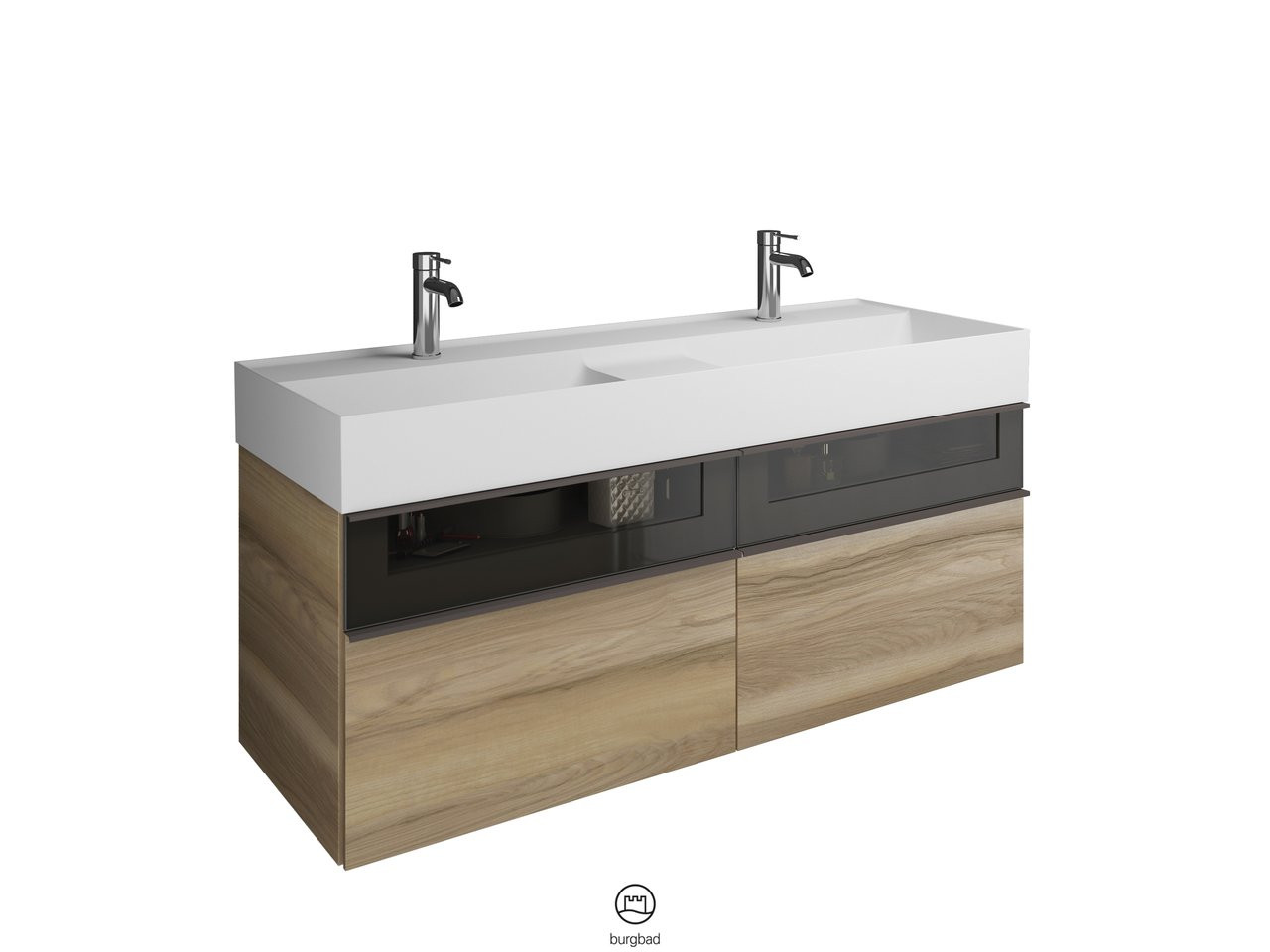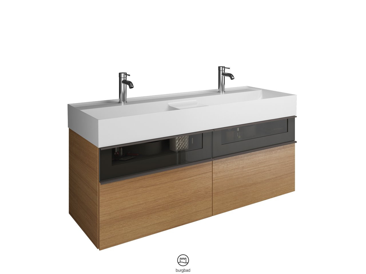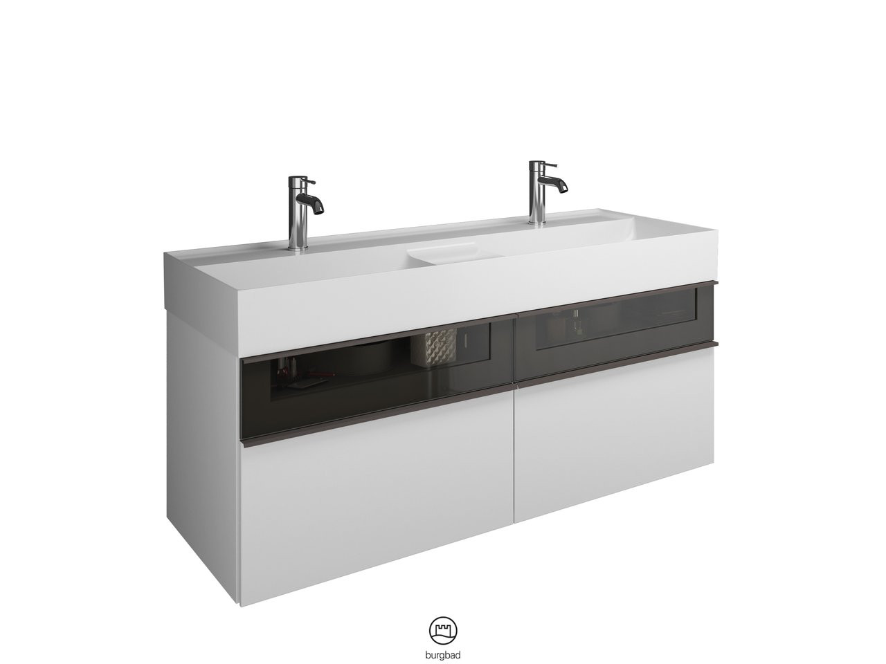 Burgbad Mineralguss Doppelwaschtisch-Unterschrank Set Yumo 131,5x61x47cm, 2 Schubladen/Auszüge, Waschtisch weiß, Melamin