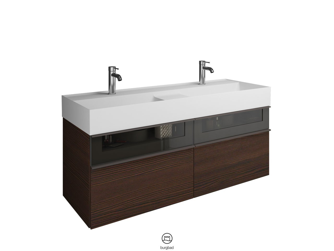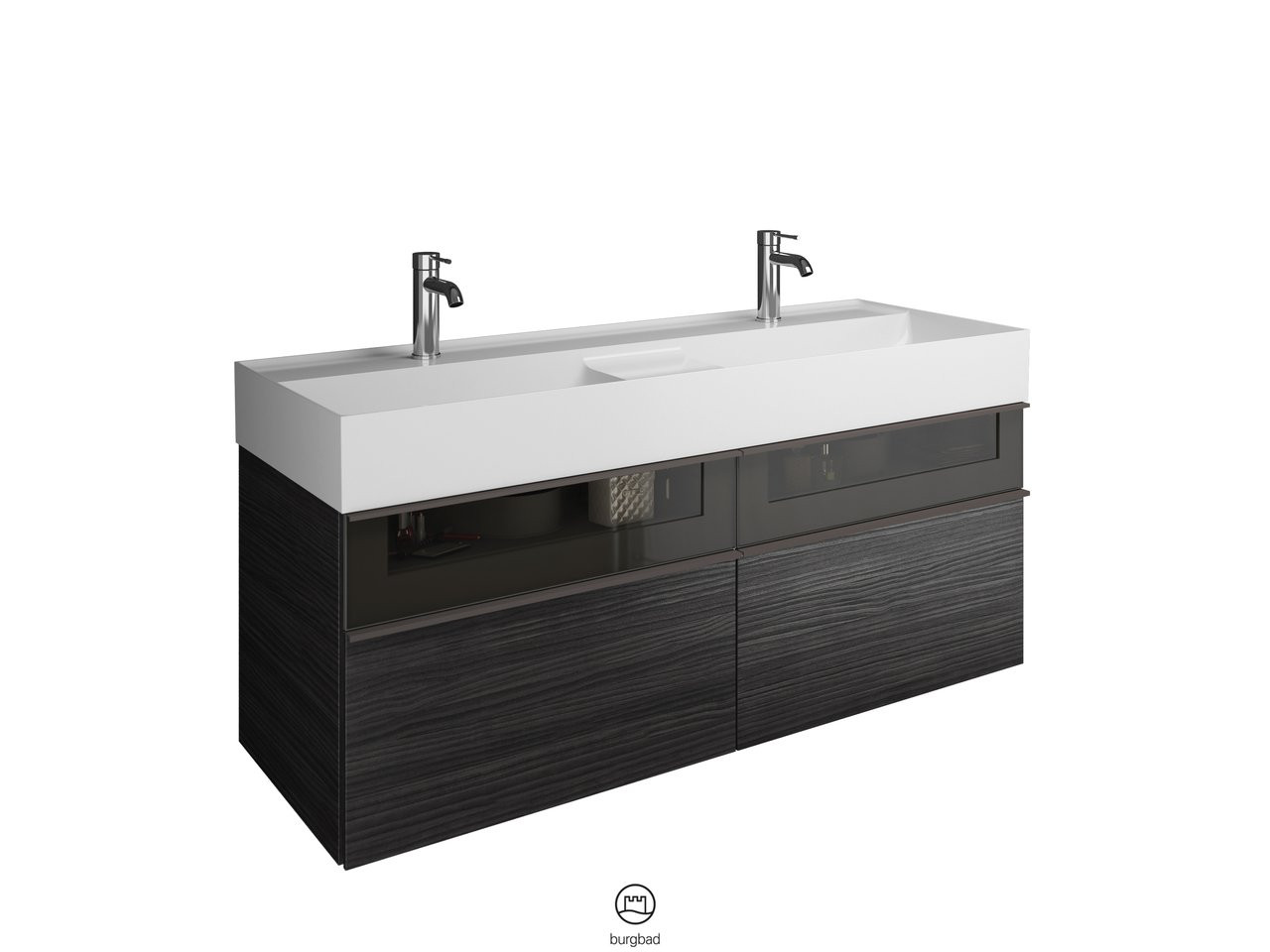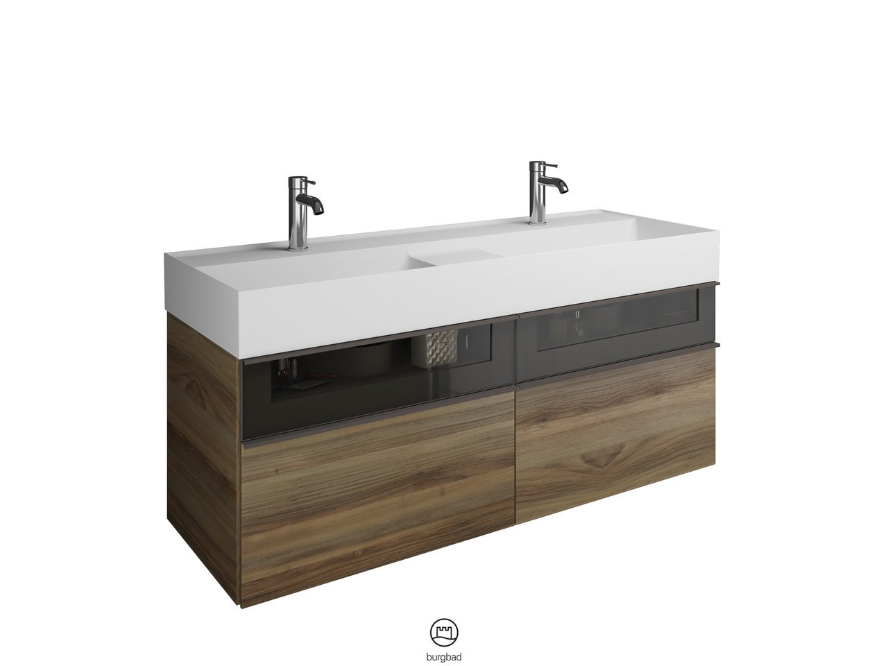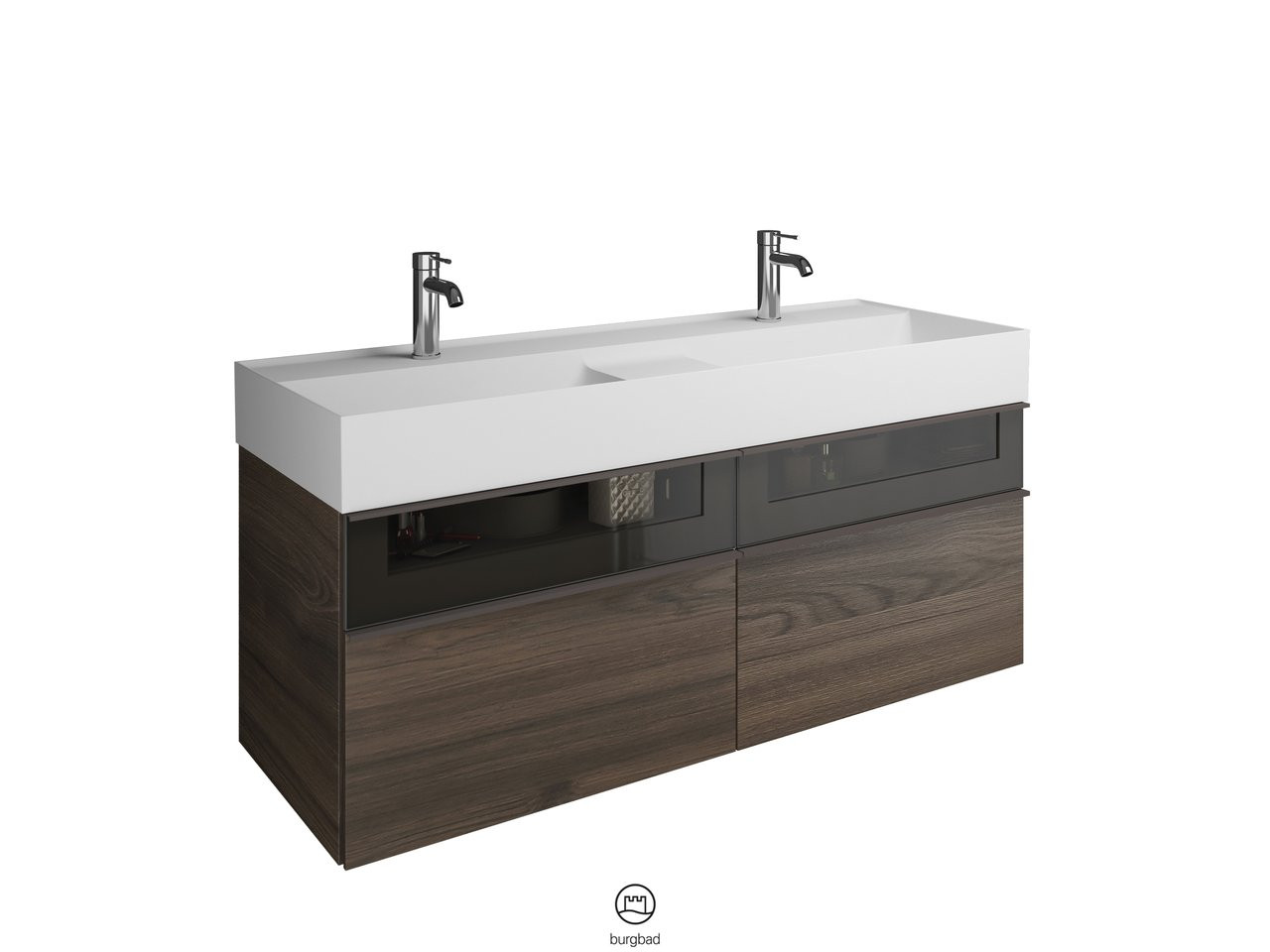 Burgbad Mineralguss Doppelwaschtisch-Unterschrank Set Yumo 131,5x61x47cm, 2 Schubladen/Auszüge, Waschtisch weiß, Melamin