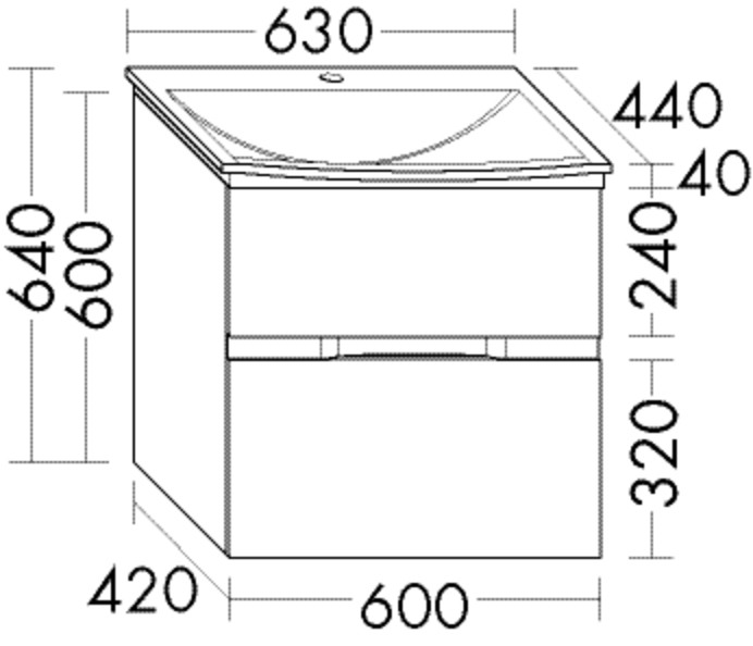 Waschtisch: Muldentiefe 120 mm, Unterschrank: Schublade oben, 300 mm tief, mit Siphonausschnitt und Inneneinteilung, Auszug unten, 300 mm tief, mit cleanFlow