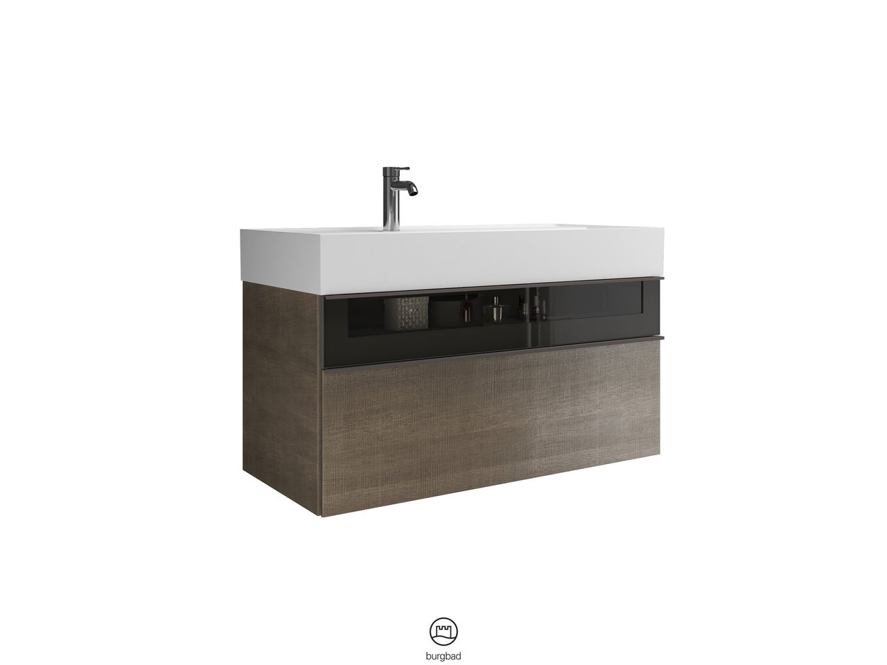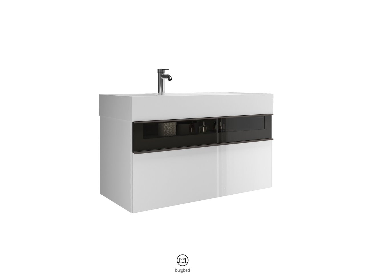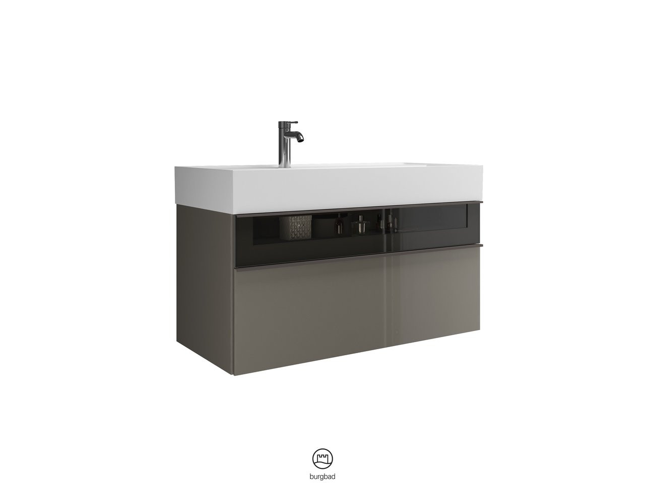 Waschtisch: Muldentiefe 105 mm, Unterschrank: 1 Schublade oben, 300 mm tief, Alurahmenfront mit Rauchglaseinsatz und Siphonausschnitt, 1 Auszug unten, 350 mm tief, mit cleanFlow