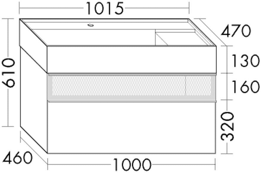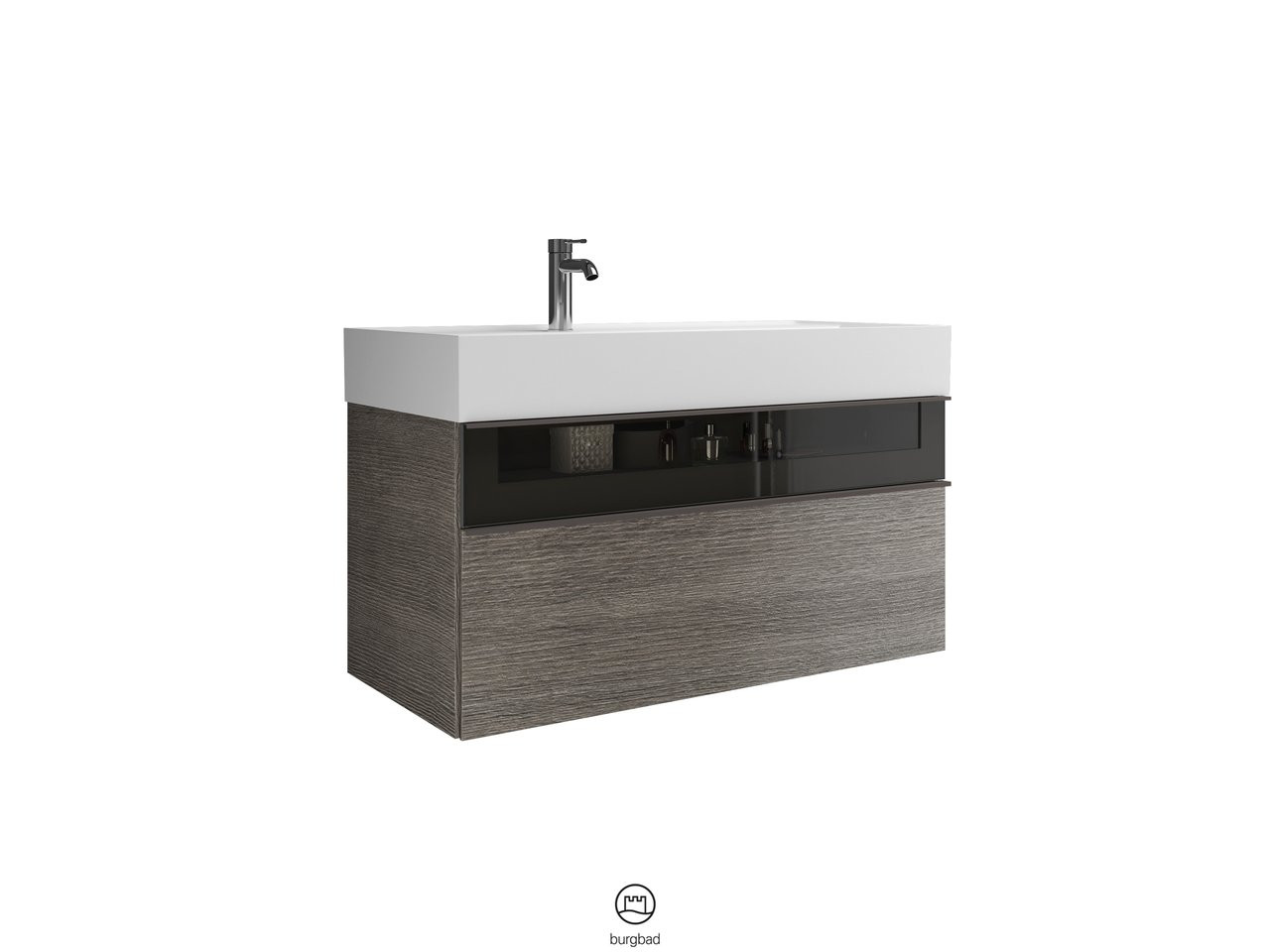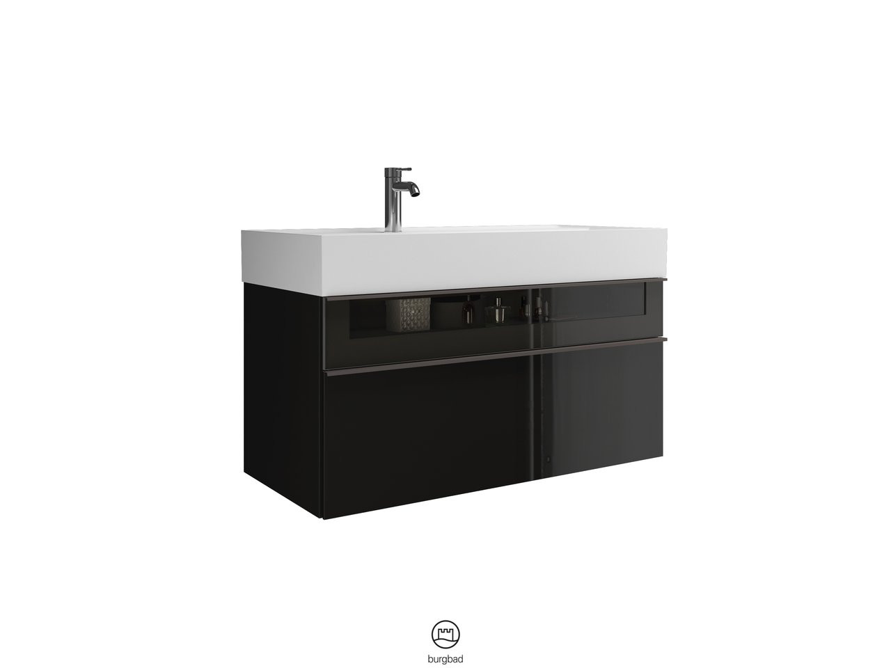 Waschtisch: Muldentiefe 105 mm, Unterschrank: 1 Schublade oben, 300 mm tief, Alurahmenfront mit Rauchglaseinsatz und Siphonausschnitt, 1 Auszug unten, 350 mm tief, mit cleanFlow