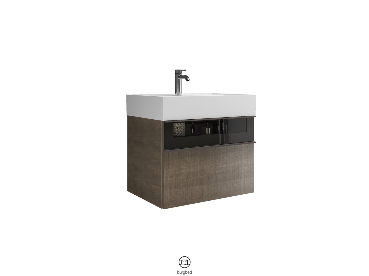 Waschtisch: Muldentiefe 105 mm, Beckenmaß 655 x 470 mm, Unterschrank: 1 Schublade oben, 300 mm tief, Alurahmenfront mit Rauchglaseinsatz und Siphonausschnitt, 1 Auszug unten, 350 mm tief, mit cleanFlow
