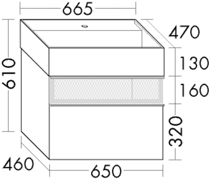 Waschtisch: Muldentiefe 105 mm, Beckenmaß 655 x 470 mm, Unterschrank: 1 Schublade oben, 300 mm tief, Alurahmenfront mit Rauchglaseinsatz und Siphonausschnitt, 1 Auszug unten, 350 mm tief, mit cleanFlow