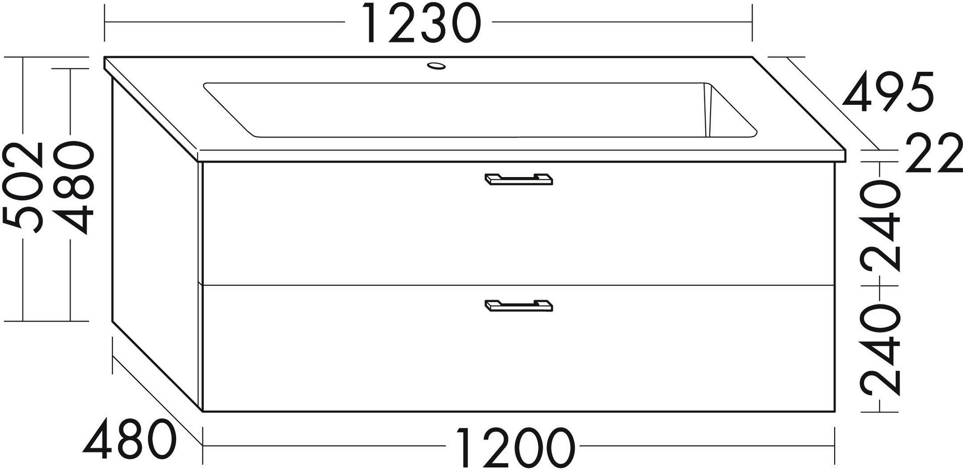 Waschtisch: Muldentiefe 120 mm, Beckenmaß 968 x 291 mm, Waschtischunterschrank, Schublade oben mit Siphonausschnitt, Auszug unten, mit Raumsparsiphon