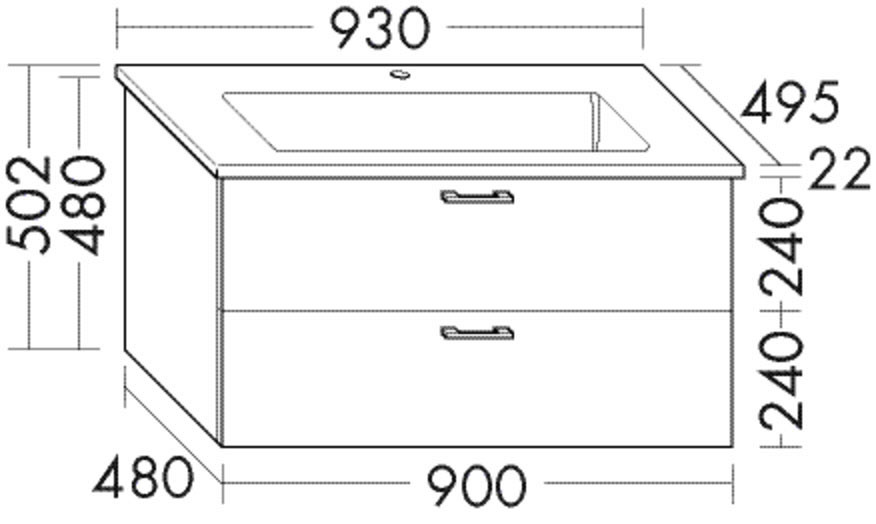 Keramik-Waschtisch, Muldentiefe: 120 mm, Beckenmaß 680 x 291 mm, Waschtischunterschrank, 1 Schublade oben mit Siphonausschnitt, 1 Auszug unten, mit Raumsparsiphon